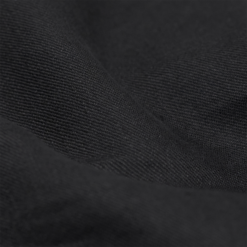 素材は、リネン・レーヨン・ポリエステルのやや細番手の混紡糸を用いた、ツイル生地を使用しています。仕上げにワッシャー加工を施すことで、程よくクタッとした質感や風合い、ヴィンテージようなニュアンスのある表情に仕上げています。
