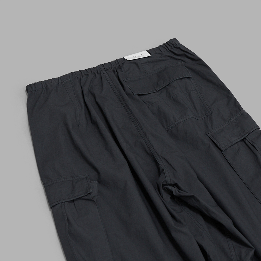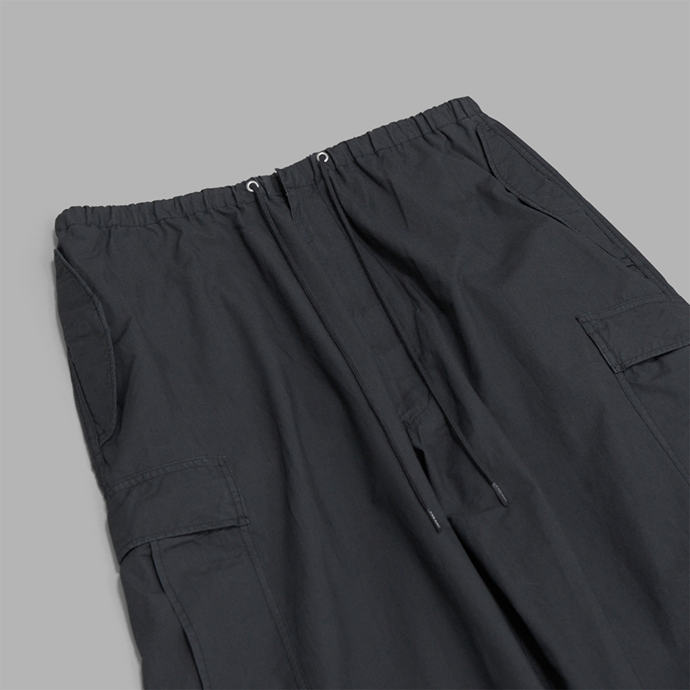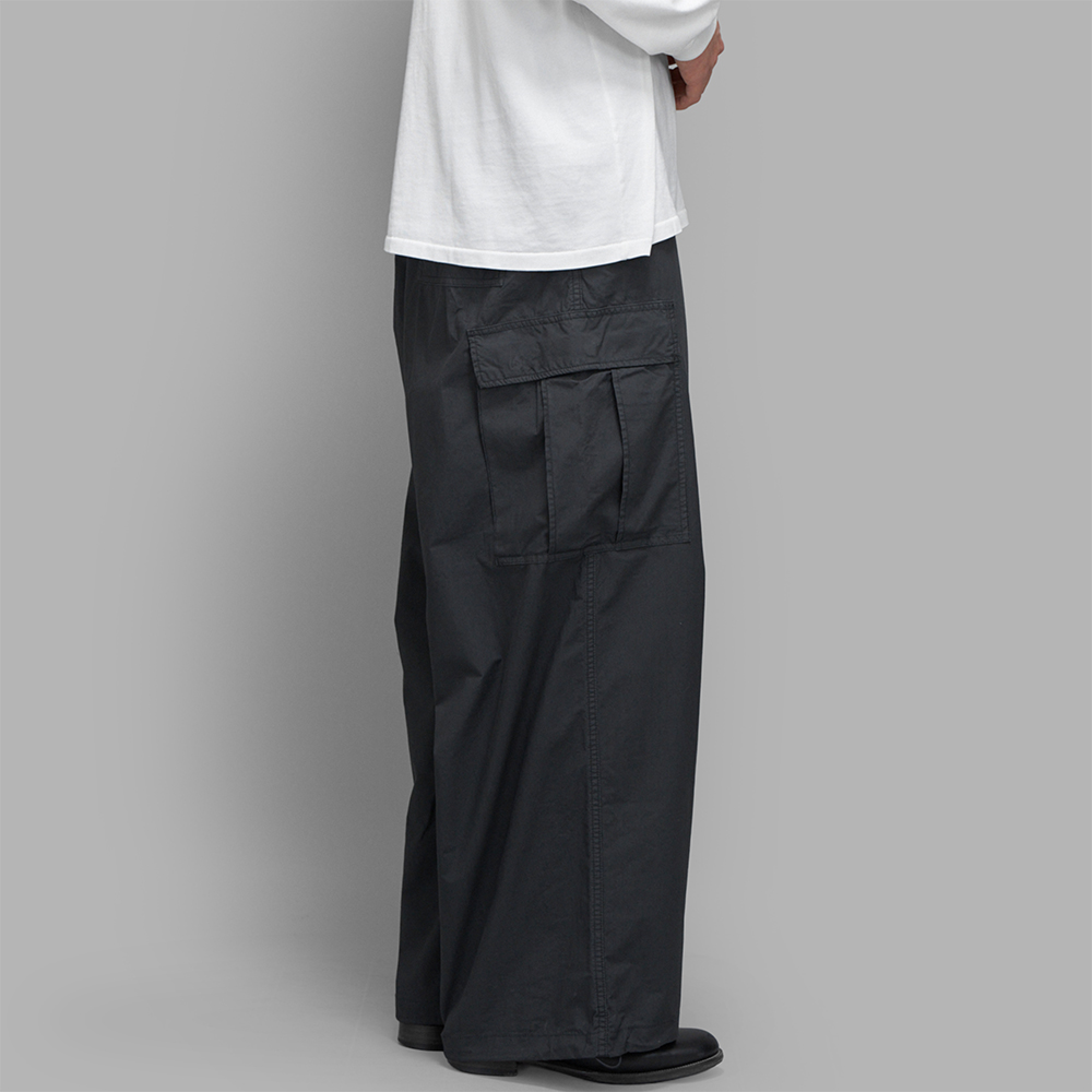 型は、M51オーバーパンツをベースに、ファッションアイテムとして着用しやすいようサイズバランスや、すっきりとしたデザインに再構築しています。裾はゴムの仕様で、絞ることでシルエットの調整が可能です。前立てはジップフライです。