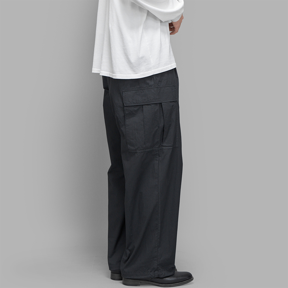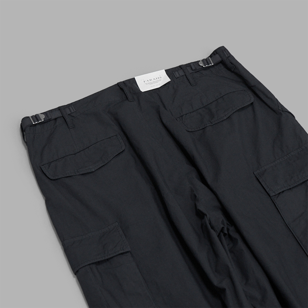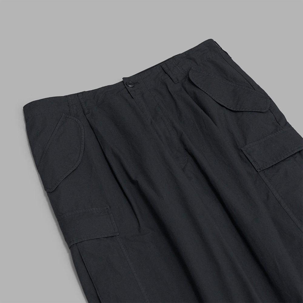 型は、M65フィールドパンツをベースに、ファッションアイテムとして着用しやすいようサイズバランスや、すっきりとしたデザインに再構築しています。裾はゴムの仕様で、絞ることでシルエットの調整が可能です。前立てはジップフライです。