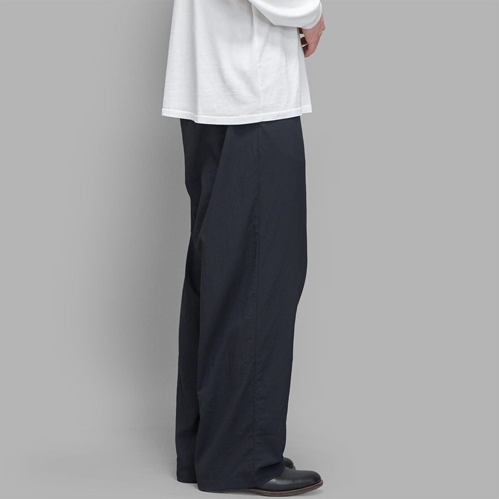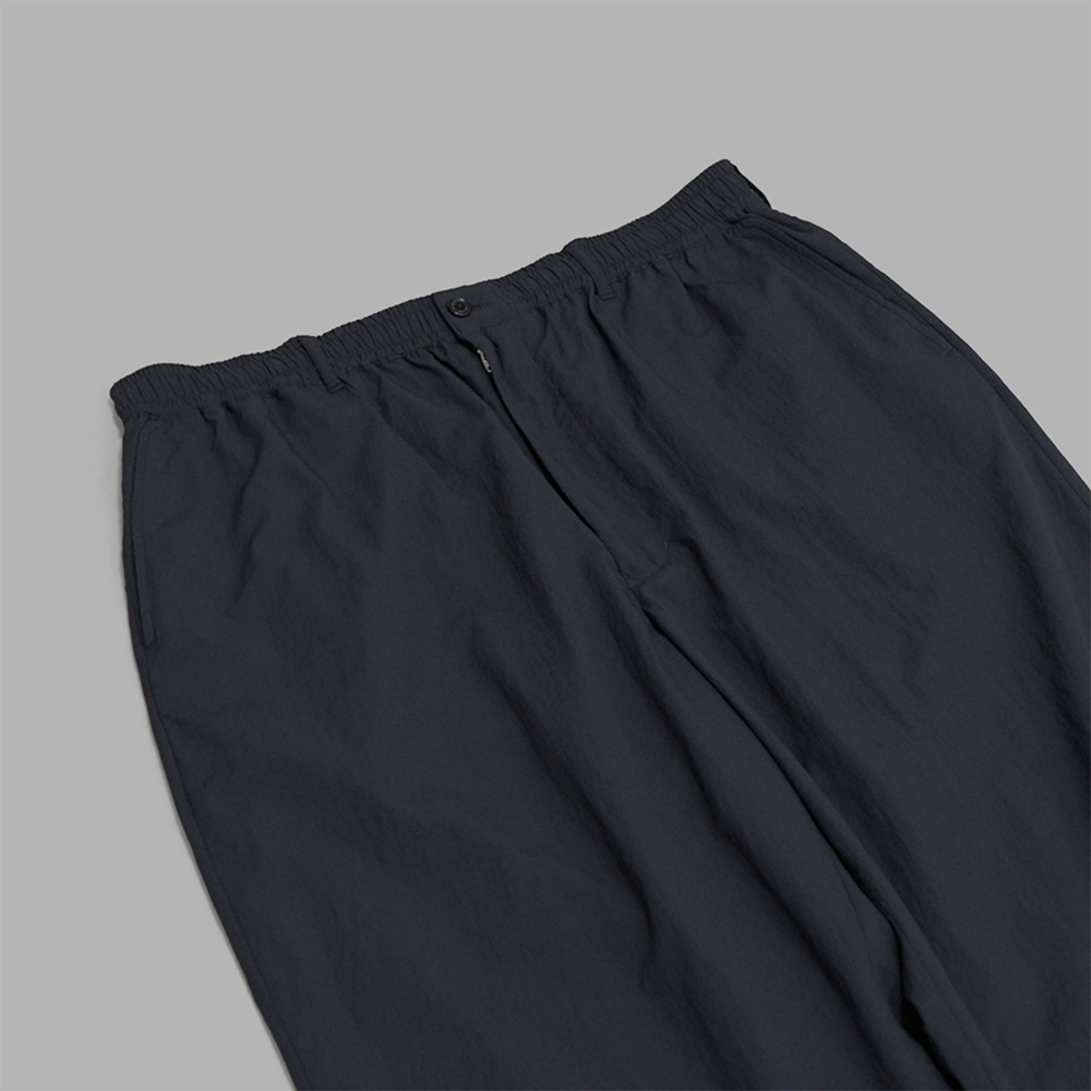 型は、ワイドシルエットのイージーパンツです。腰回りはドローコードとゴムを通した仕様で作られており、ベルトレスでの着用もできますが、ベルトループも付いていますので、ベルトを通して着用することも可能です。また、使いやすさとデザインのバランスを取るため、ポケットの形状の抑揚を控えめに調整しています。前立てはジップフライです。