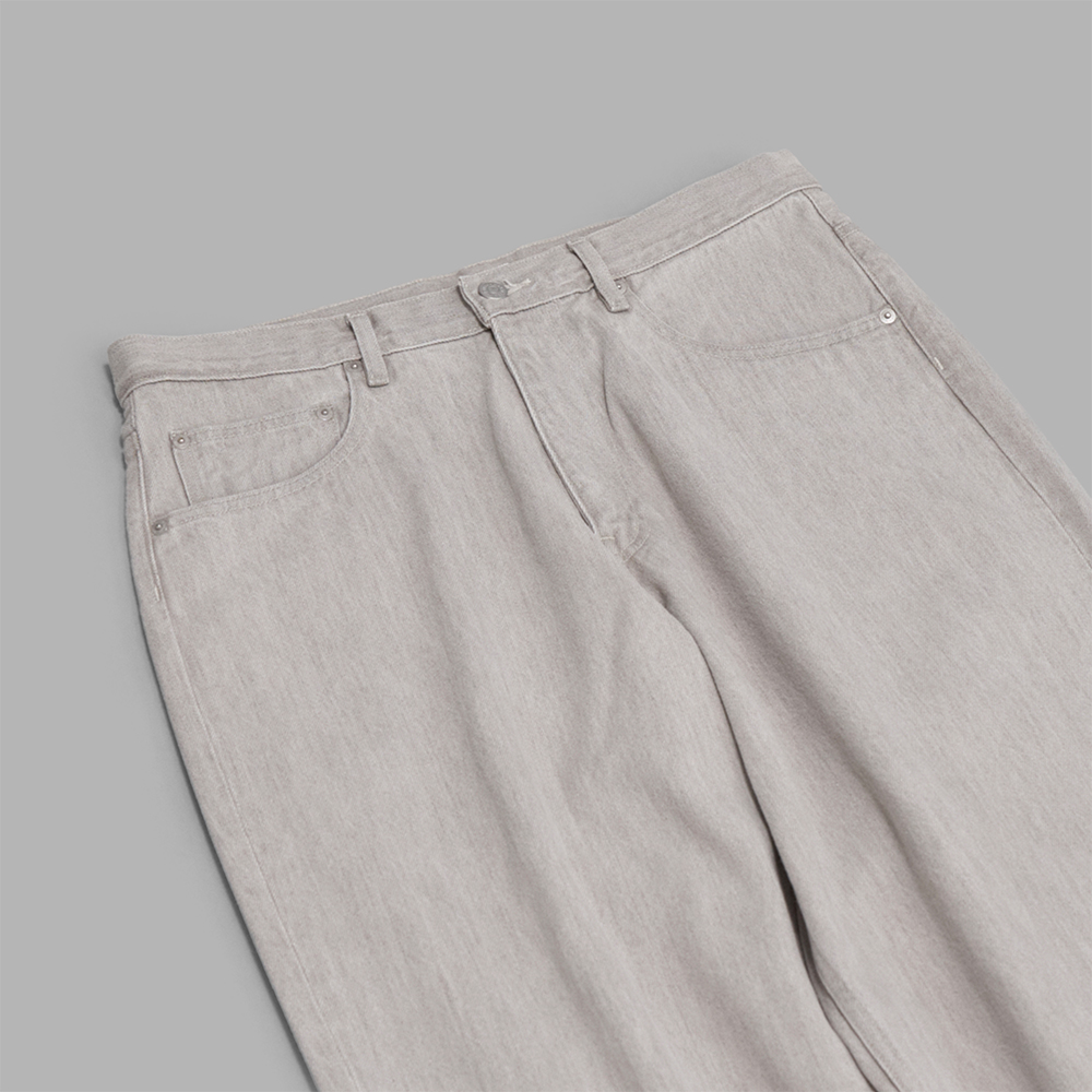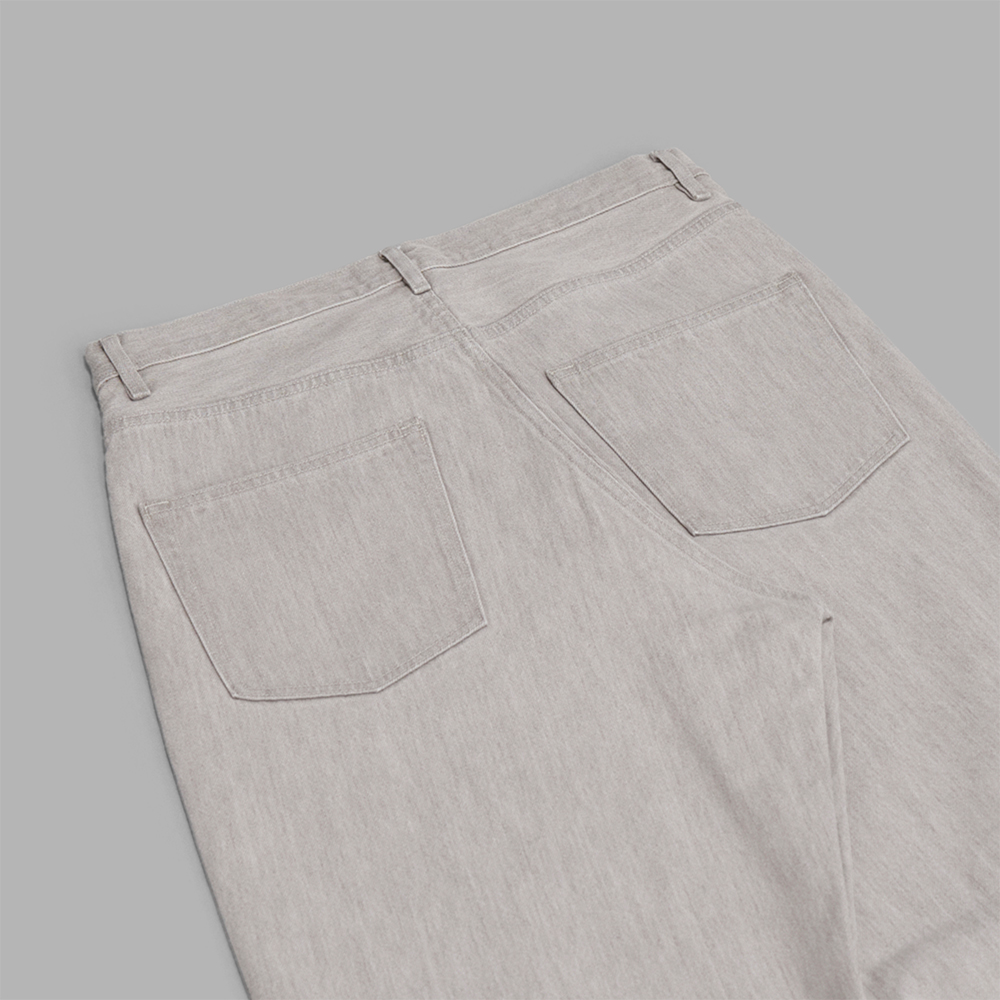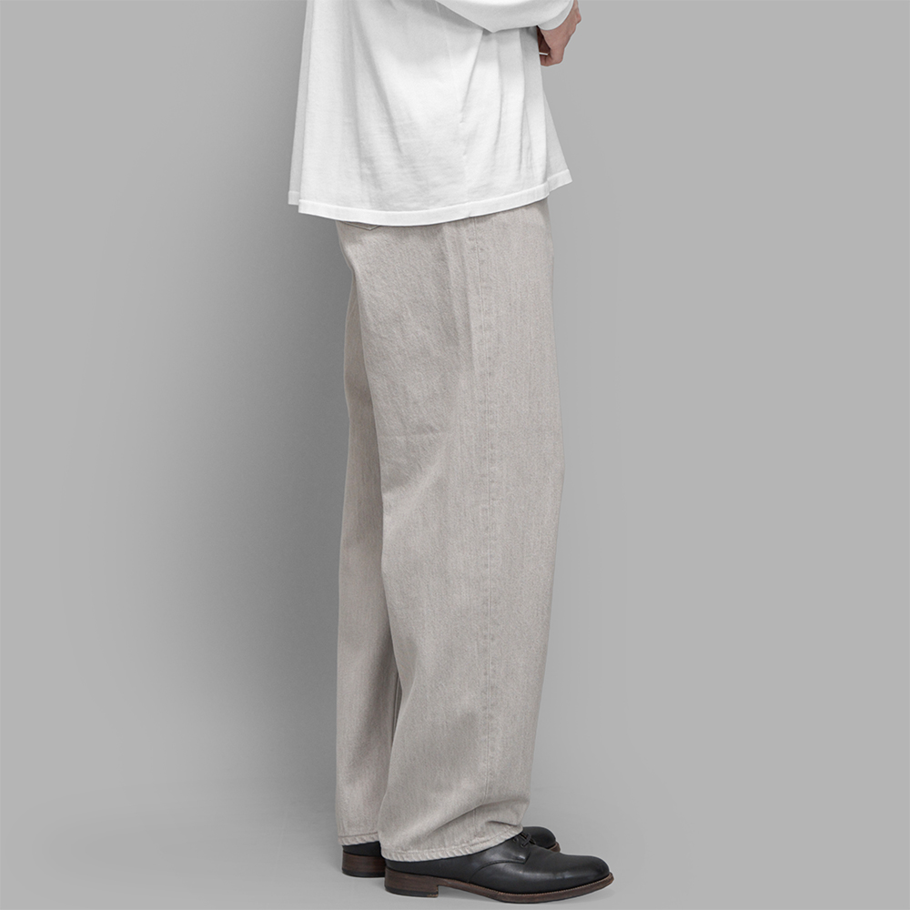 型は、ベーシックな5ポケットのデニムパンツをベースとし、ワタリから裾に向かって緩やかにテーパードのかかる、同ブランドらしいワイドシルエットで作成しています。股下の長さはフルレングスのイメージで設定し、前立てはジップ開きで作られています。