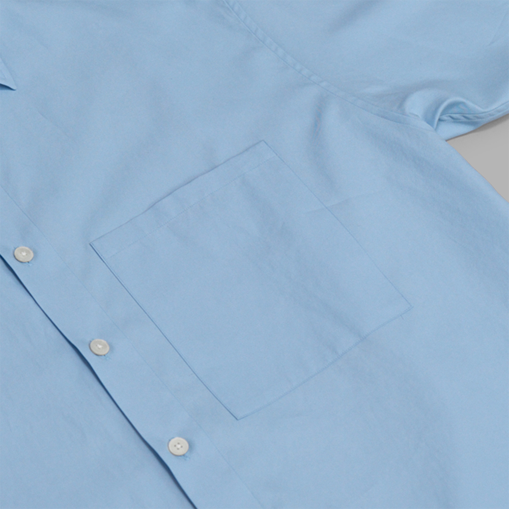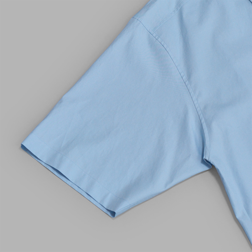 型は、全体的にゆったりしたシルエットで製作された、レギュラーカラーの半袖シャツです。ベーシックなデザインですが、裾をラウンドさせることで、柔らかい印象を与え、裾を出したスタイルでも上品に着用いただけます。胸ポケットは身頃のサイズ感にあわせて大きめにデザインされています。