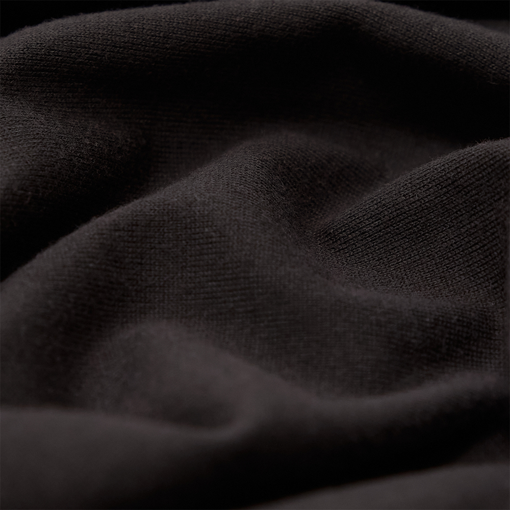 表に防縮加工+糸起毛加工を施したシルク糸、裏にスビンコットンの甘拠りの糸をリバーシブル組織で編み上げたジャージー素材を使用しています。時間をかけて完成させた特別な素材は、シルクを糸起毛することで光沢を抑えつつ、カシミヤのようなソフトな風合いを加え、最高の肌触りに仕上げています。