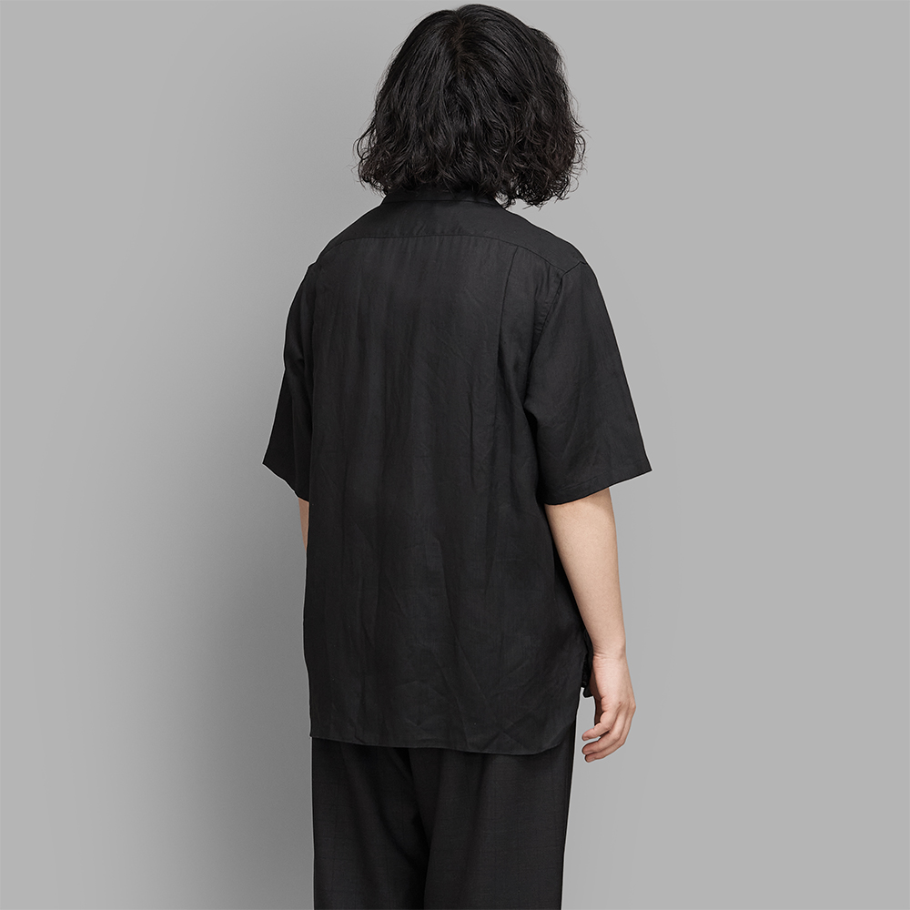 型はクラシックなオープンカラーのショートスリーブシャツです。身頃に適度なゆとりをもたせたボックスシルエットで、裾はラウンドカットで仕立てています。後ろ身頃は、動きに沿うカーブヨーク仕立てで、ボックスプリーツを入れています。