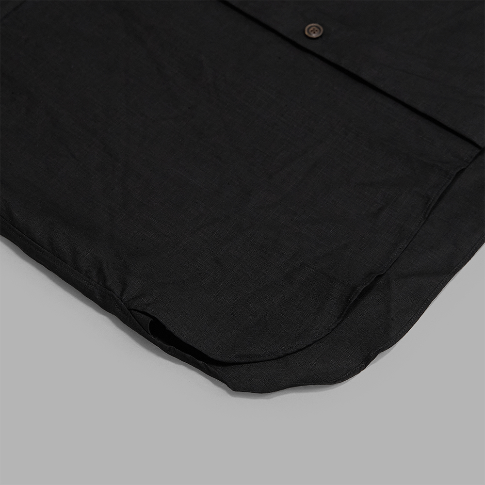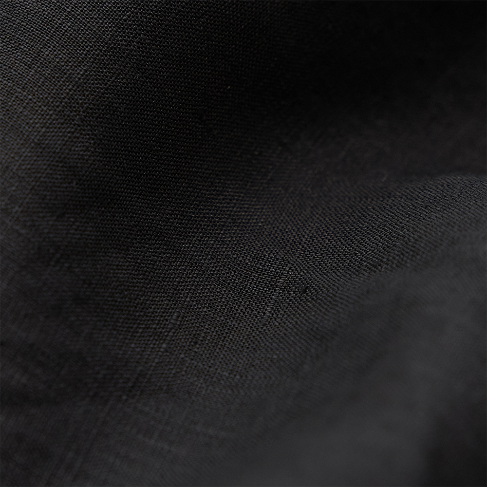 素材は、経緯⽷ともに極細リネンを使⽤した平織りの⽣地を使用しています。織布の際に経⽷が切れないよう、合成繊維の⽔溶性ビニロンを巻きつけてから織り上げ、その後ワッシャー加⼯を施してビニロンを溶かし、独特の⾵合いに仕上げています。さらに、染⾊前にシルケット加⼯を施し、表⾯を美しく整えてから染⾊することで、上品で洗練された⾵合いを実現しています。