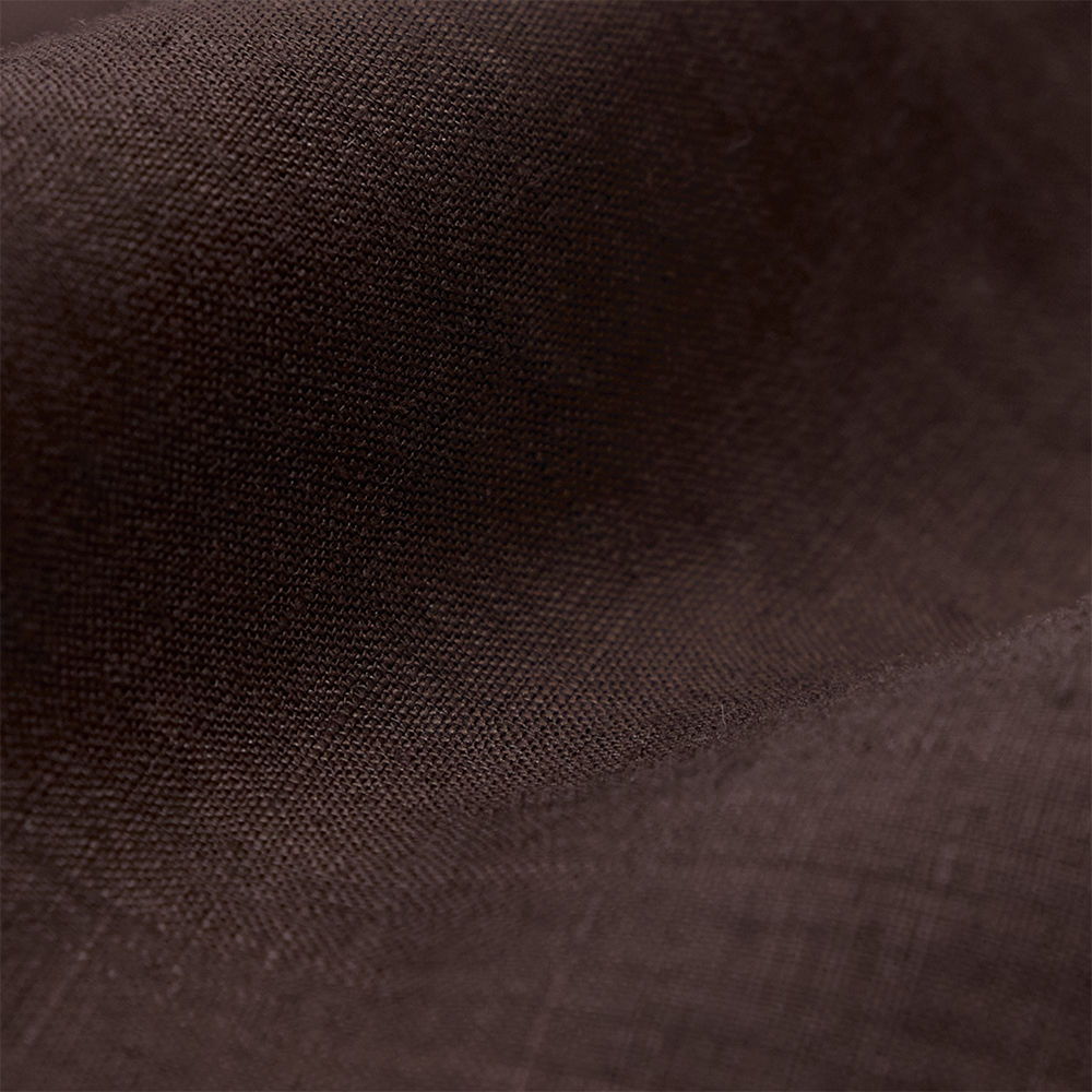 素材は、経緯⽷ともに極細リネンを使⽤した平織りの⽣地を使用しています。織布の際に経⽷が切れないよう、合成繊維の⽔溶性ビニロンを巻きつけてから織り上げ、その後ワッシャー加⼯を施してビニロンを溶かし、独特の⾵合いに仕上げています。さらに、染⾊前にシルケット加⼯を施し、表⾯を美しく整えてから染⾊することで、上品で洗練された⾵合いを実現しています。