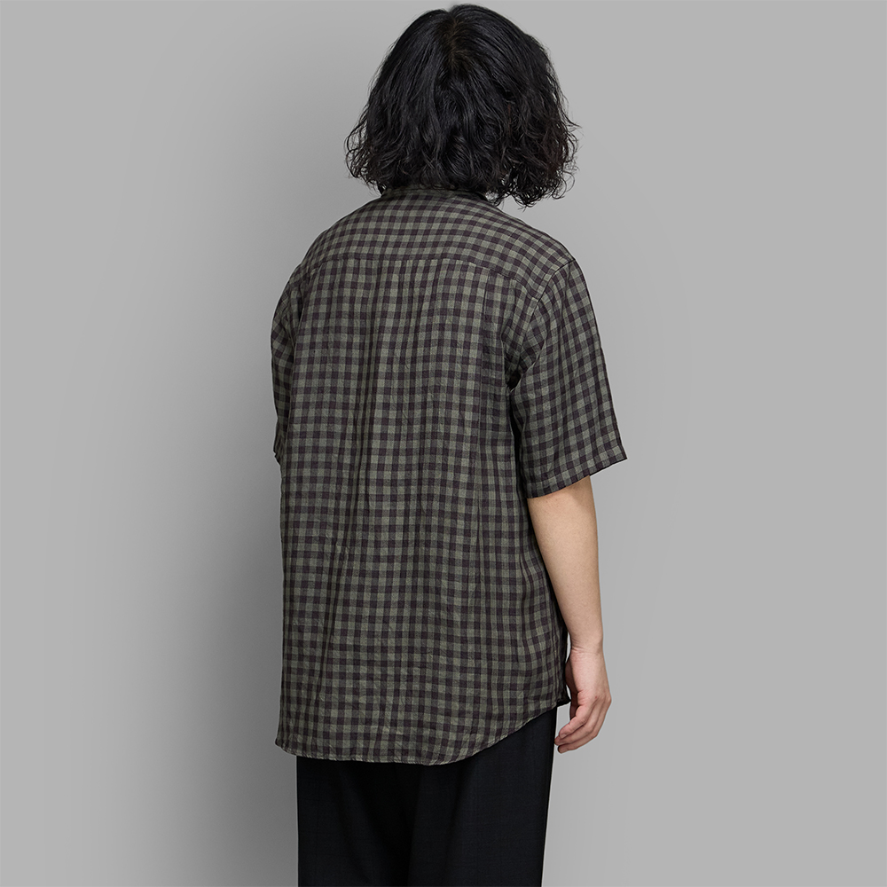 型は、やや小ぶりな襟を配したレギュラーカラーのショートスリーブシャツです。身頃に適度なゆとりをもたせたボックスシルエットで、裾はラウンドカットで仕立てています。後ろ身頃は、動きに沿うカーブヨーク仕立てで、ボックスプリーツを入れています。