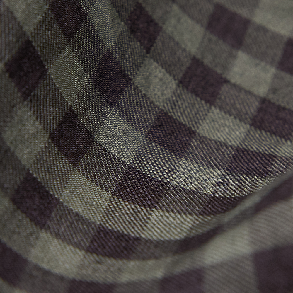 細番手のリネン糸を特殊な染料でかせ染めを施し、2⾊のトップカラー調の⽷で構成したギンガムチェック素材を使用しています。織布の際に経⽷が切れないよう、合成繊維の⽔溶性ビニロンを巻きつけてから織り上げ、その後ワッシャー加⼯を施してビニロンを溶かし、独特の⾵合いに仕上げています。⽷染めによるムラ感が、奥⾏きのある表情を⽣み、深みのあるギンガムチェック柄を表現しています。