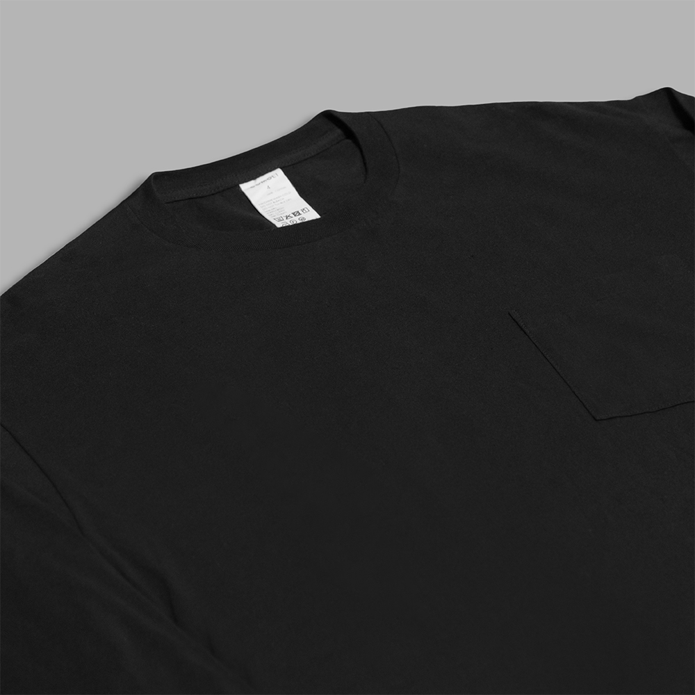 型は、肩や身頃に適度なゆとりもたせたクルーネックの長袖Teeシャツです。胸ポケット、袖リブを付けています。