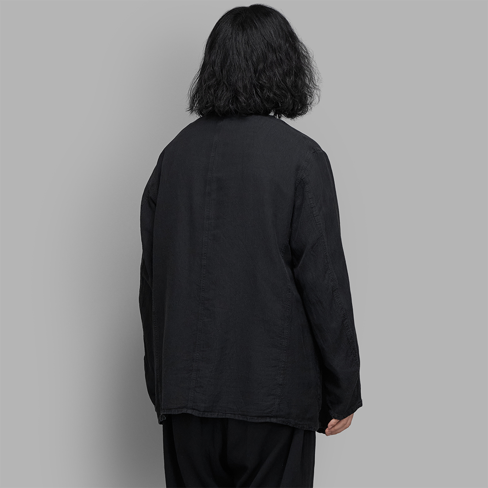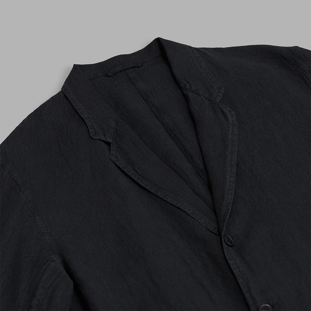 型は、ゆったりしたサイズ感で作製されたテーラーラペルのジャケットです。表裏共地の無双仕立てにより、適度な膨らみをもたせつつ、1枚の生地が非常に薄いため、着心地はとても軽いです。内ポケットはありません。