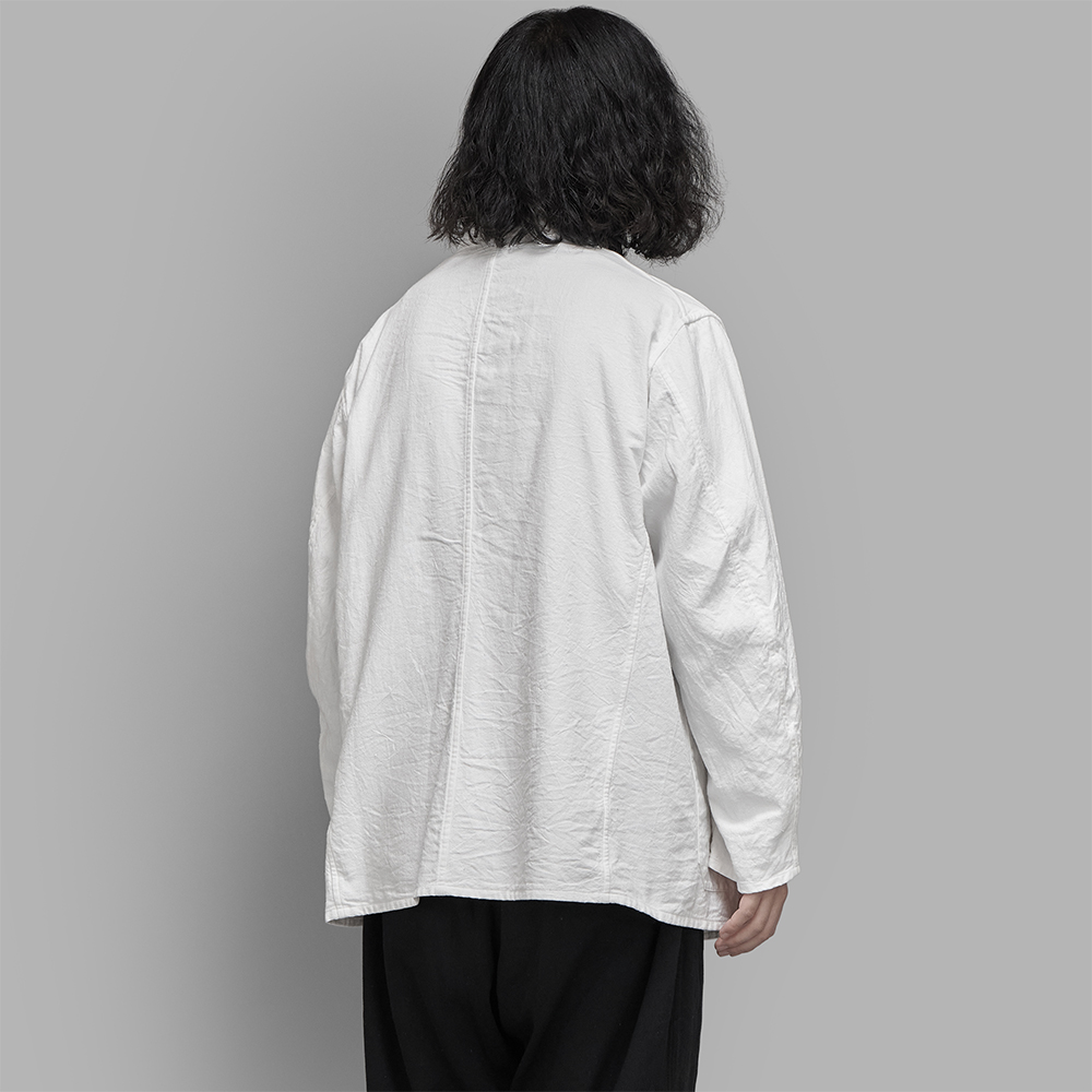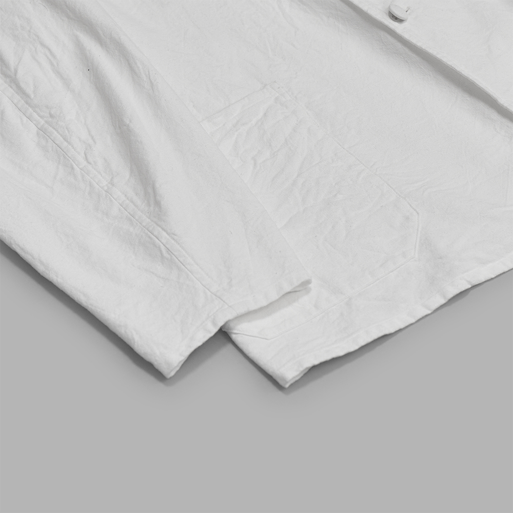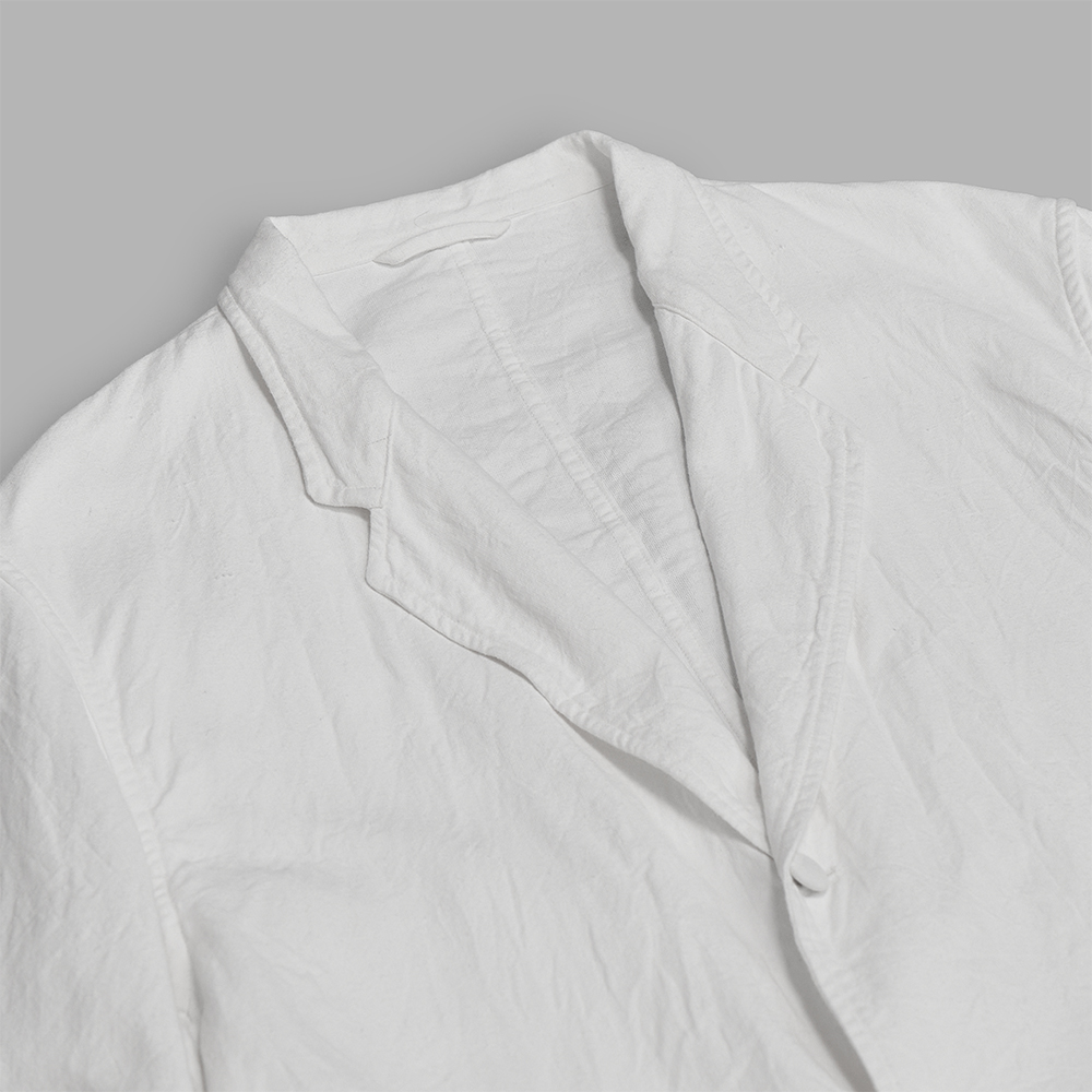 馴染みの良い共地のくるみボタンも相まって、白のジャケットでも自然に取り入れていただけます。袖を捲って、シャツのような感覚で合わせる着こなしもおすすめです。