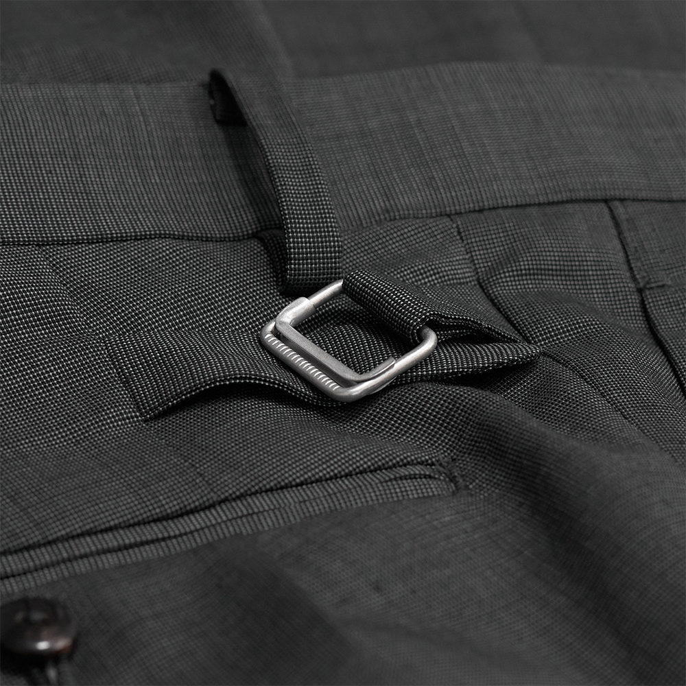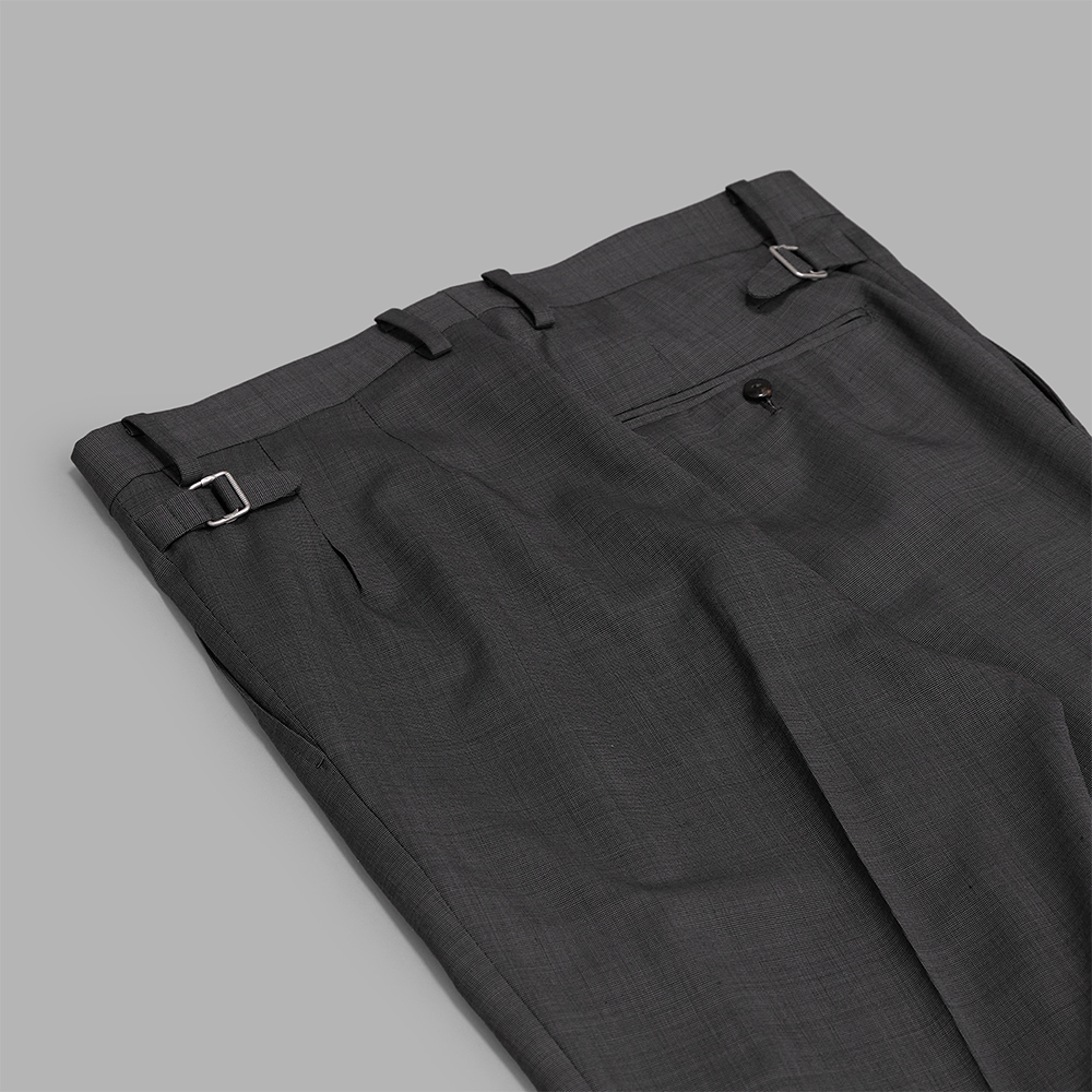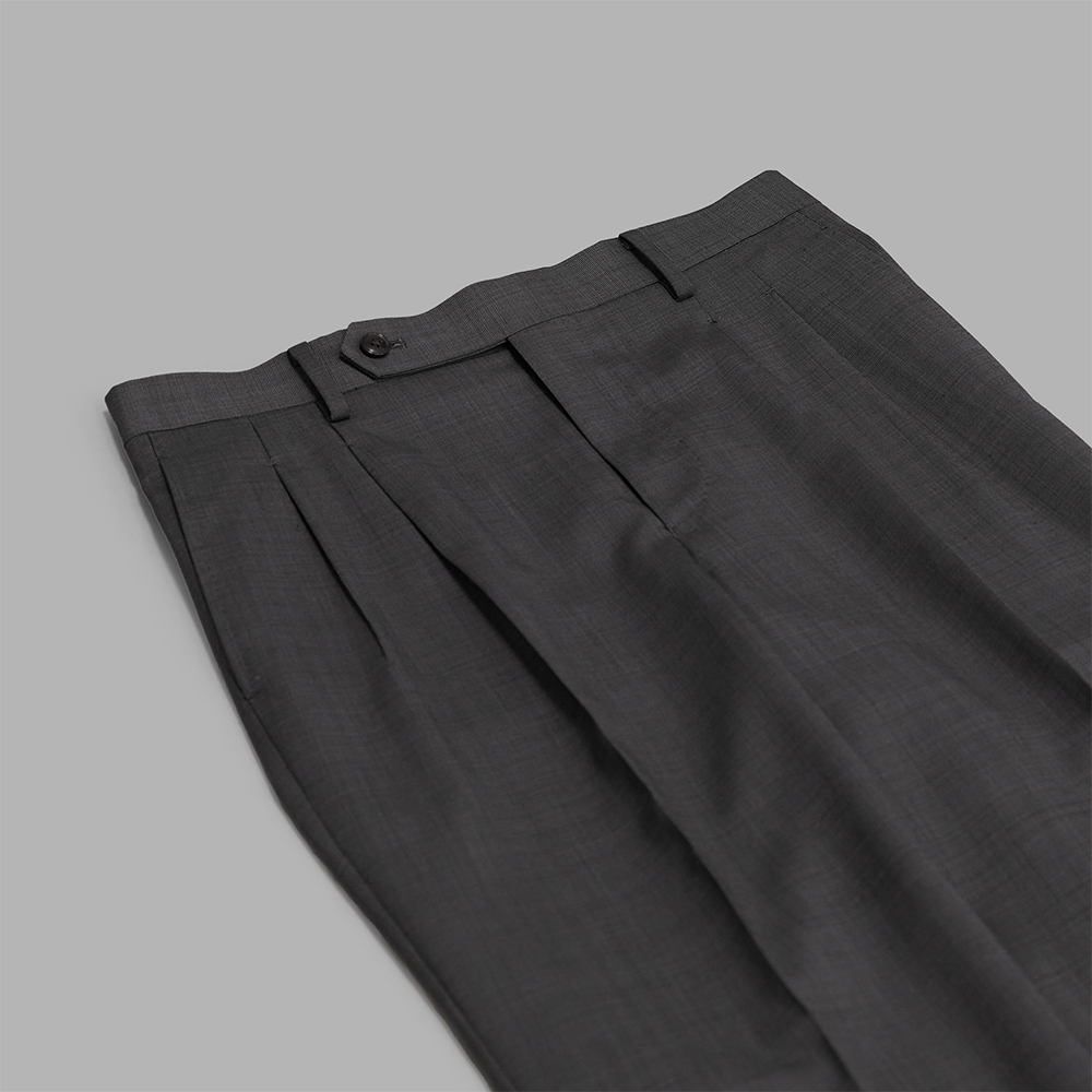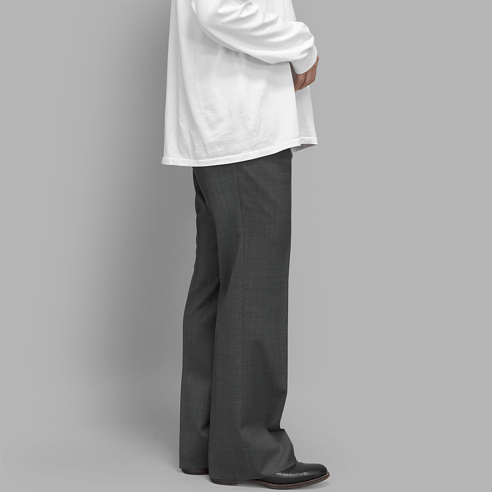 永遠スラックスの派生から展開された新型のフレアスラックスです。型は、一般的なフレアパンツに比べ、膝下から裾にかけて、微かに広がりを感じられる、微フレアのシルエットになります。また、ツータックにすることで、腰回りにもゆとりが生まれ、全体的にリラックス感のあるシルエットに仕上げています。腰にはサイドアジャスターが付き、前立てはジップフライで、中は半裏の仕様です。