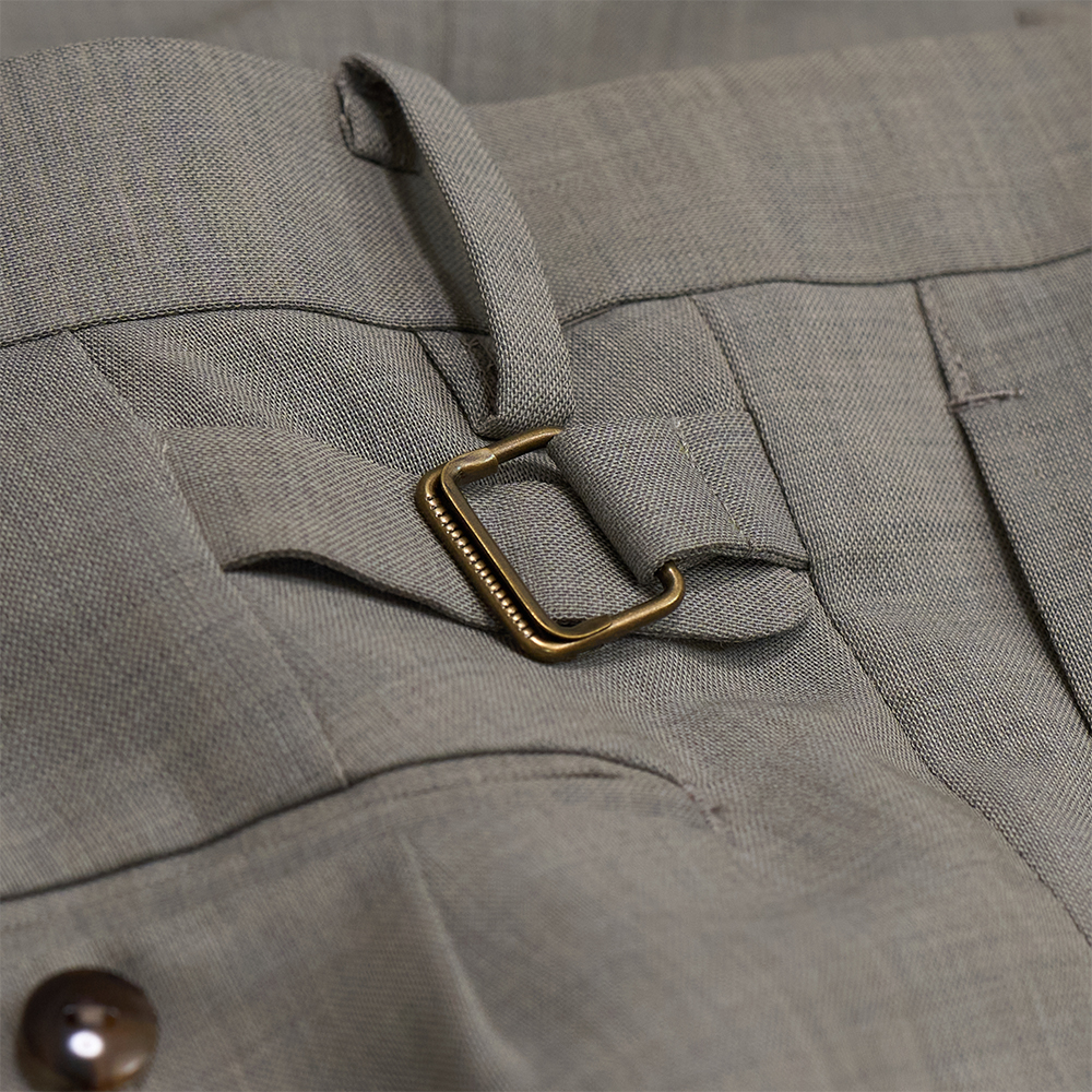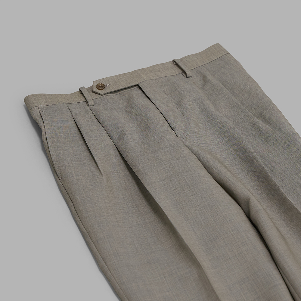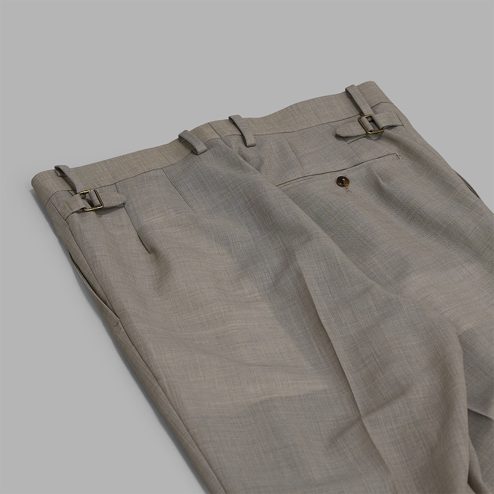 永遠スラックスの派生から展開された新型のフレアスラックスです。型は、一般的なフレアパンツに比べ、膝下から裾にかけて、微かに広がりを感じられる、微フレアのシルエットになります。また、ツータックにすることで、腰回りにもゆとりが生まれ、全体的にリラックス感のあるシルエットに仕上げています。腰にはサイドアジャスターが付き、前立てはジップフライで、中は半裏の仕様です。