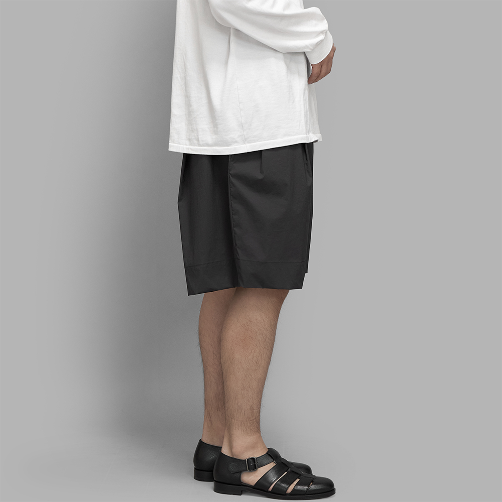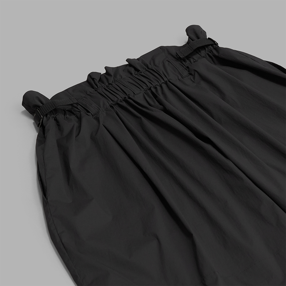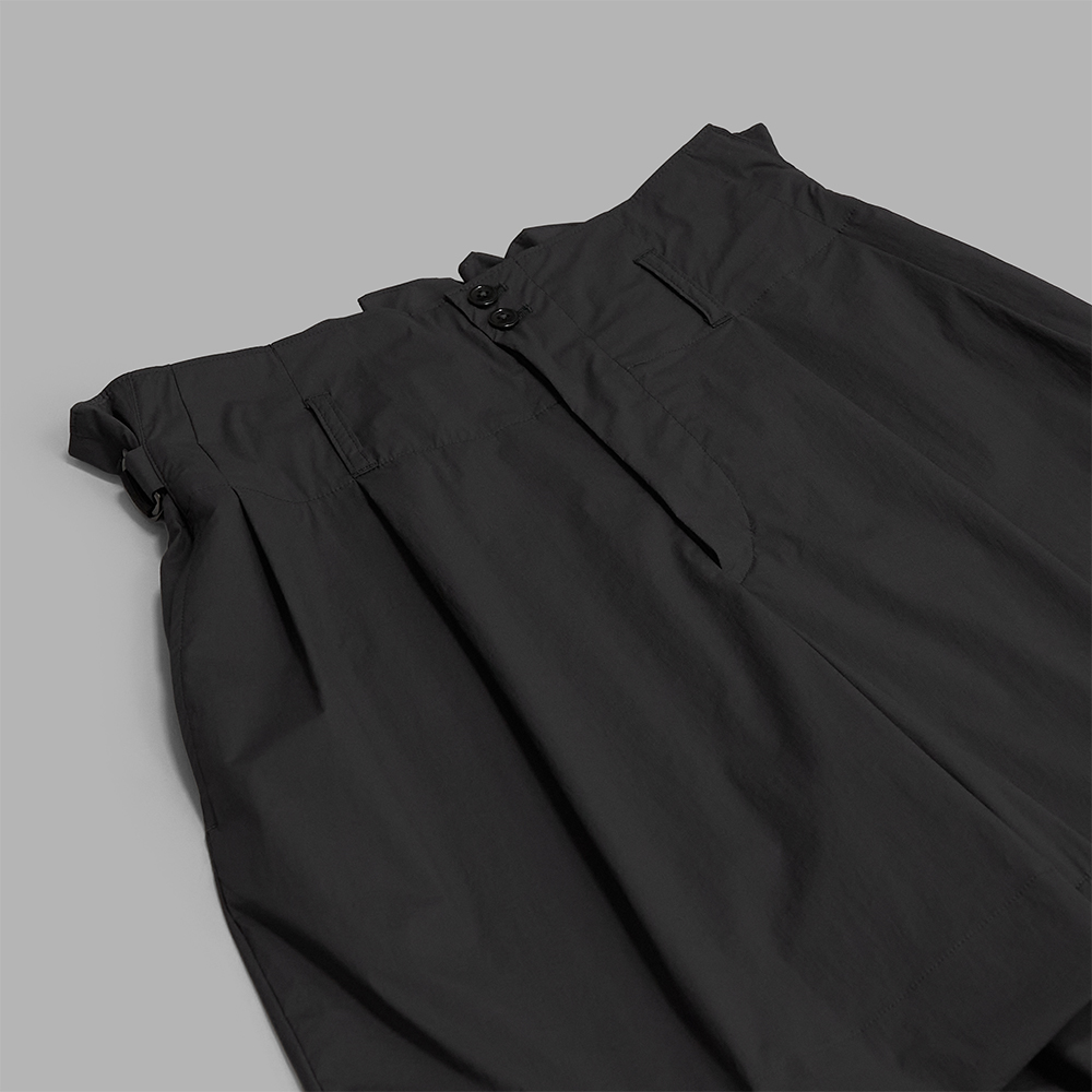 型は、リラックスしたサイズバランスで製作されたグルカショーツをベースに、広い裾幅やローライズ仕様など、独特なディテールで再構築されています。ウエストはサイドアジャスターでの調整が可能で、バック部分のみイージー仕様で製作されています。前立てはジップフライです。