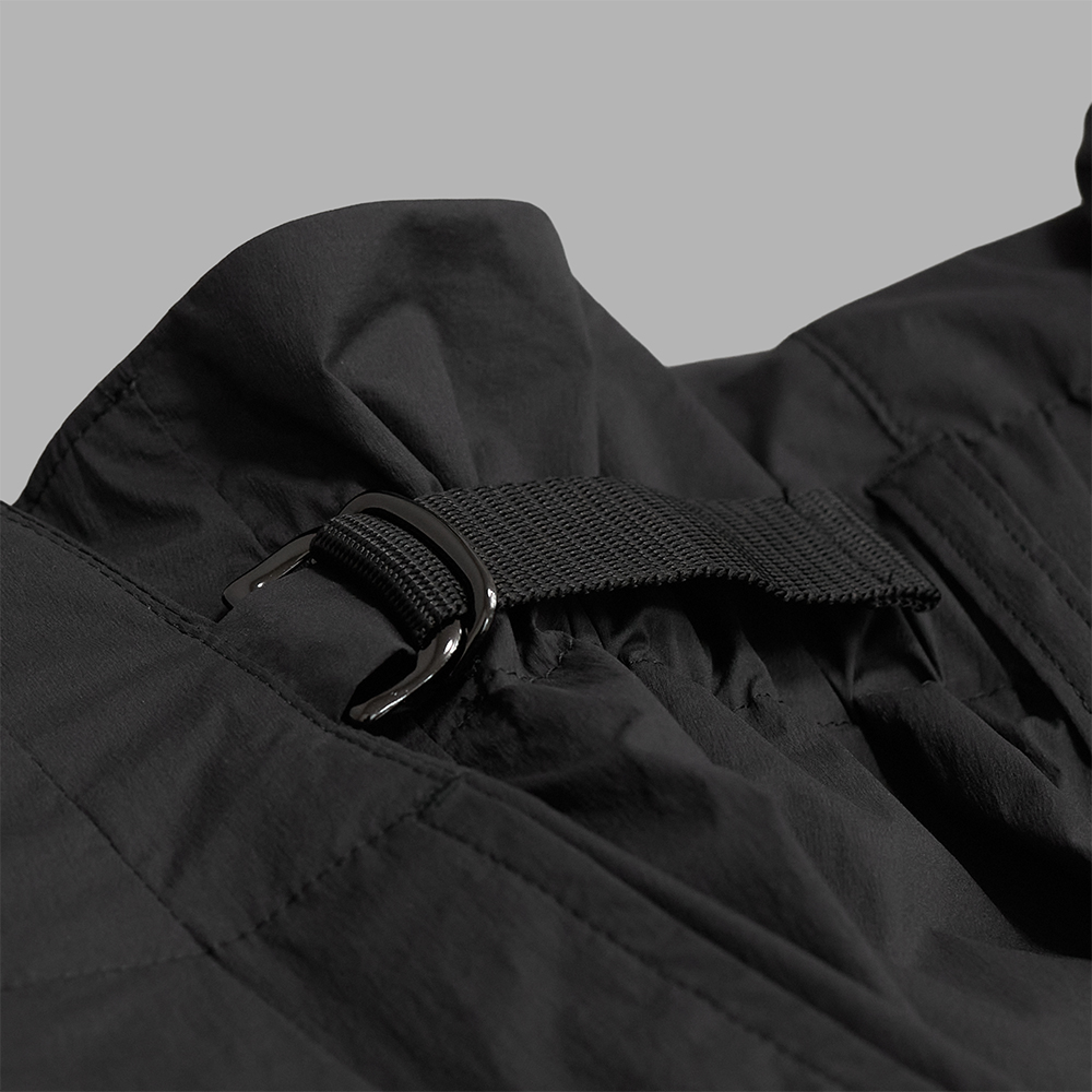 非常に薄く軽量なナイロン素材を使用しています。程よいハリを持ちながらも硬さはなく、ポリウレタン特有の弾力性により横方向のストレッチが効き、快適な着用感を実現しています。