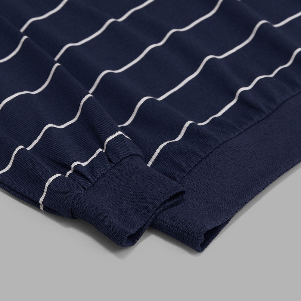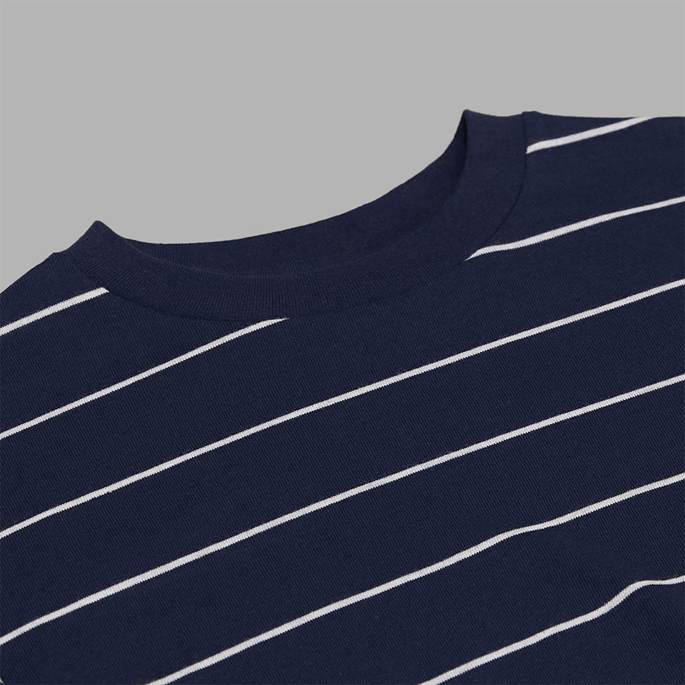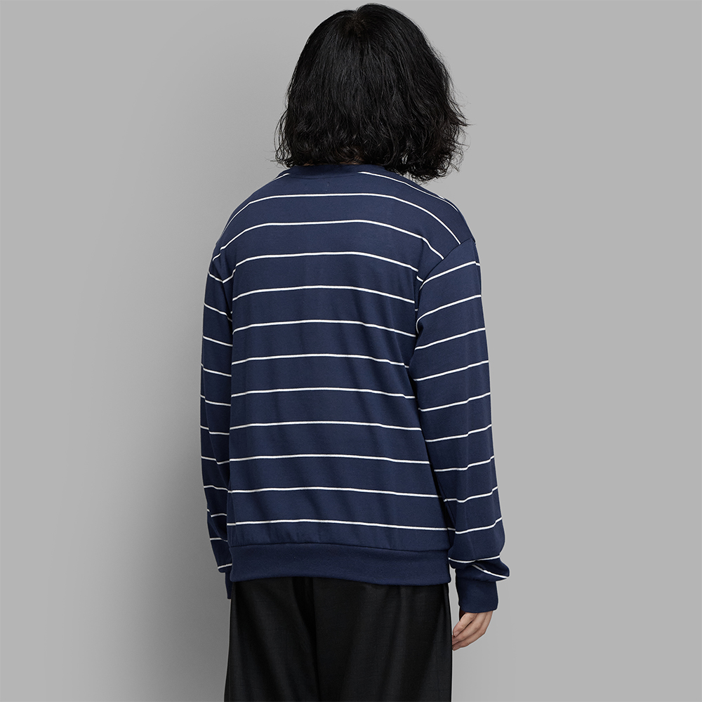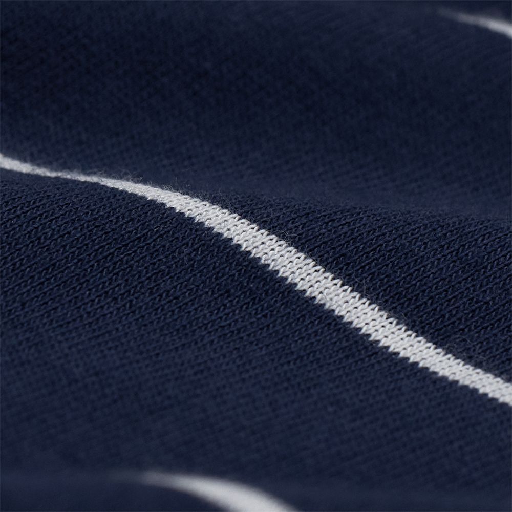 素材は、柔らかな質感の中にもサラッとしたタッチを感じられる、コットンポリエステルの混紡素材で編み立てています。ミニマルな配色でありながら、程よく存在感のあるワイドピッチのボーダーが採用されています。