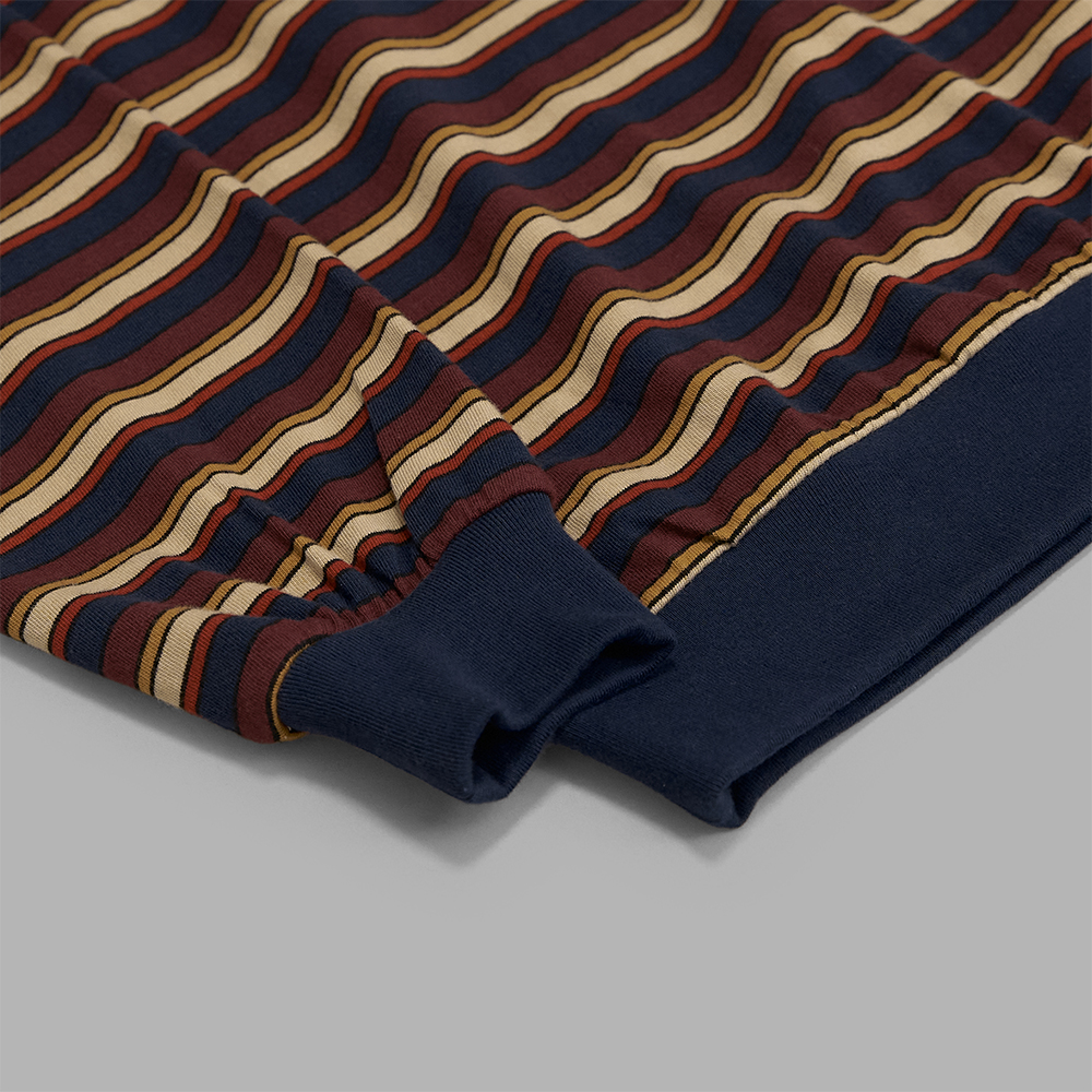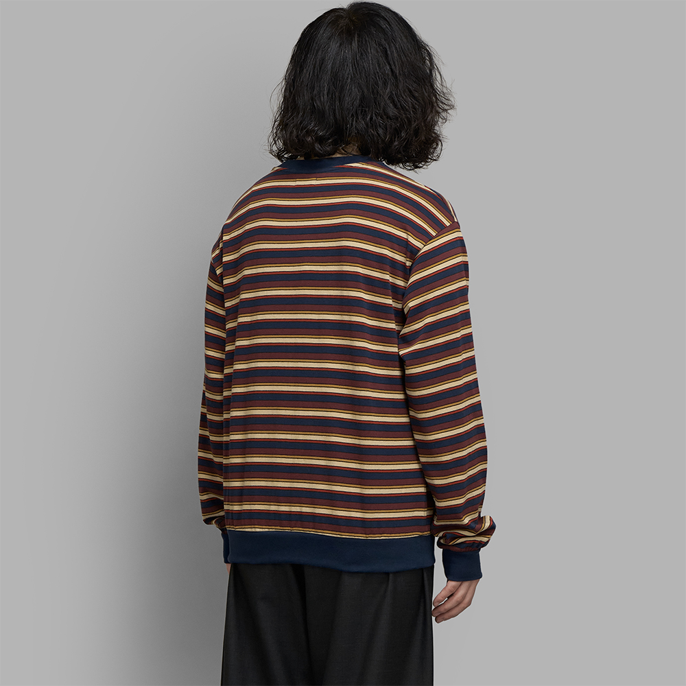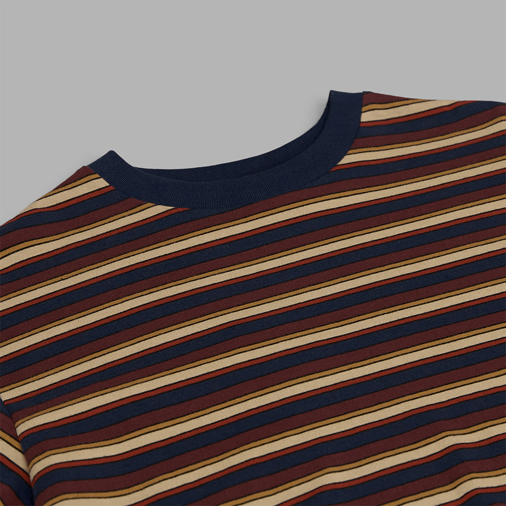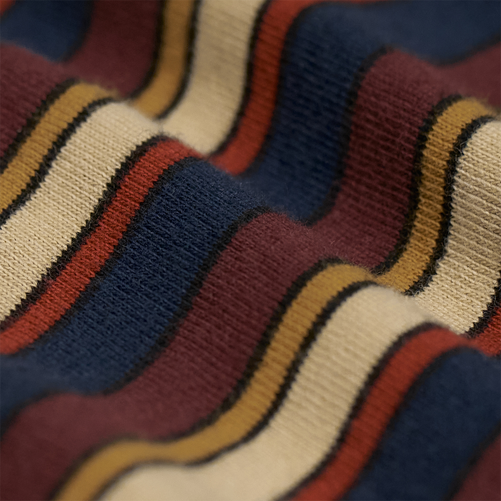 素材は、質感の柔らかなオールコットンで編み立てた天竺素材です。柄には、多色の糸を用いた、奥行きを感じられるマルチボーダーが採用されています。