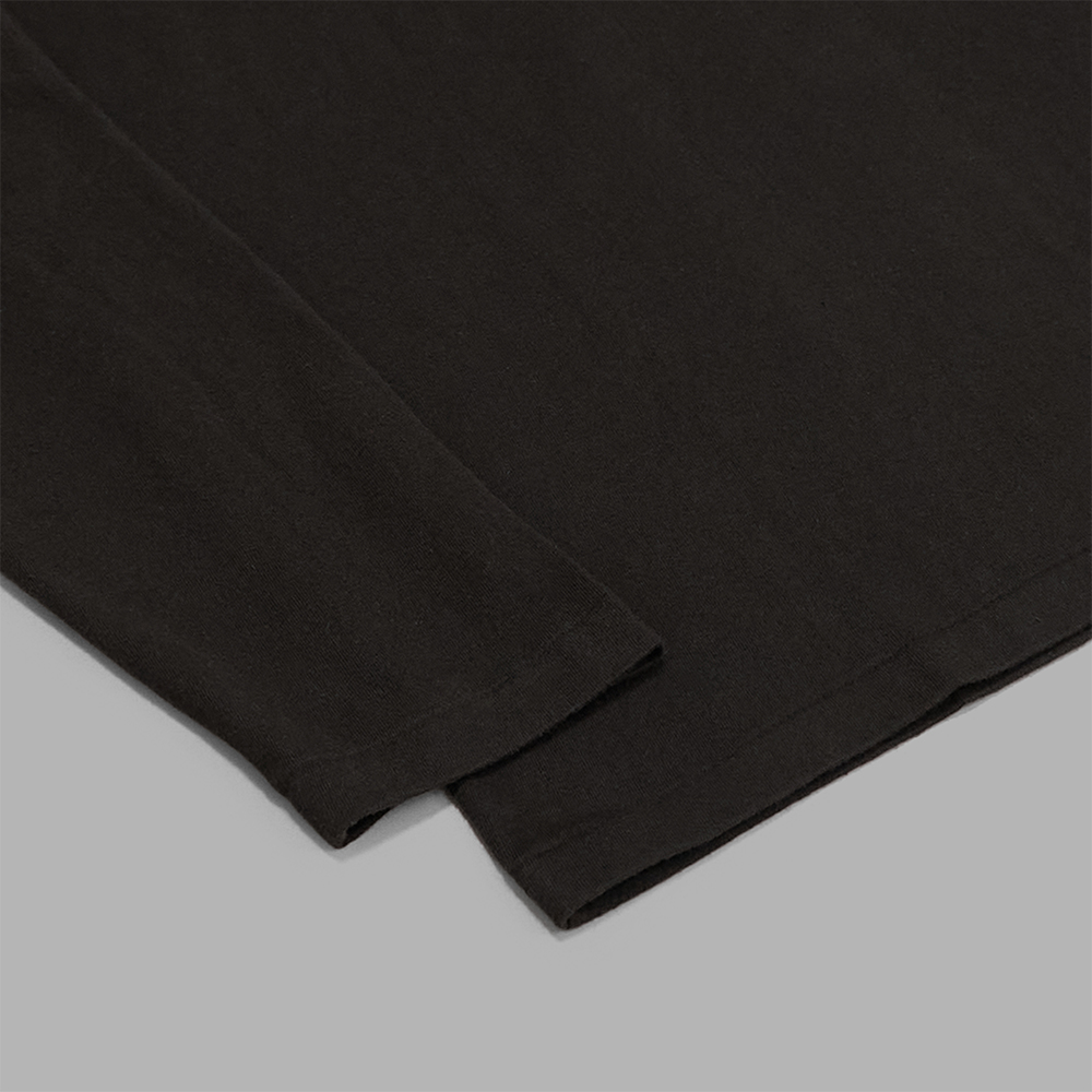 型は、ベーシックなデザインで製作されたクルーネックのL/SのTシャツです。肩が程よく落ちるデザインですが着丈はさほど長くなく、レギュラーフィットのサイズバランスで製作されています。単体での着用は勿論、シャツやジャケットのインナーとして着用しやすい印象です。