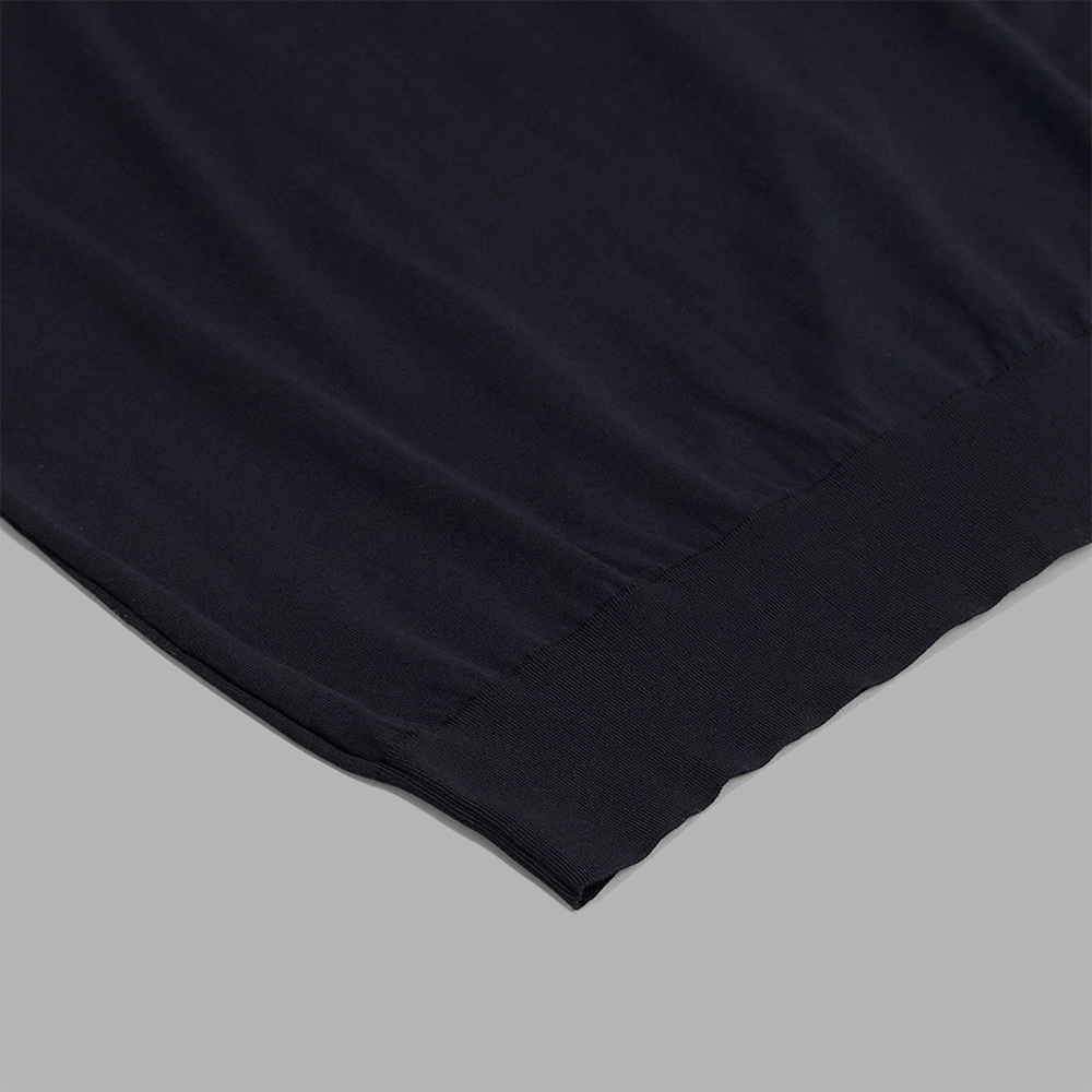 エジプトの超長綿である、ギザコットンの細番手を追撚して編み立てたハイゲージニットになります。繊細で美しい編み地と上品な光沢感を持つ素材に仕上げています。