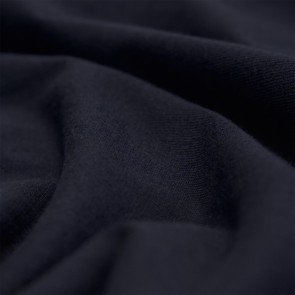 型は、全体的にゆとりを持たせたサイズバランスで作製されています。スプリットラグランスリーブの袖付けにより、前後の見え方の美しさと着心地の良さを実現してくれます。裾は適度にリブを効かせた仕立てにしており、すっきりとした丈感の仕上がりです。