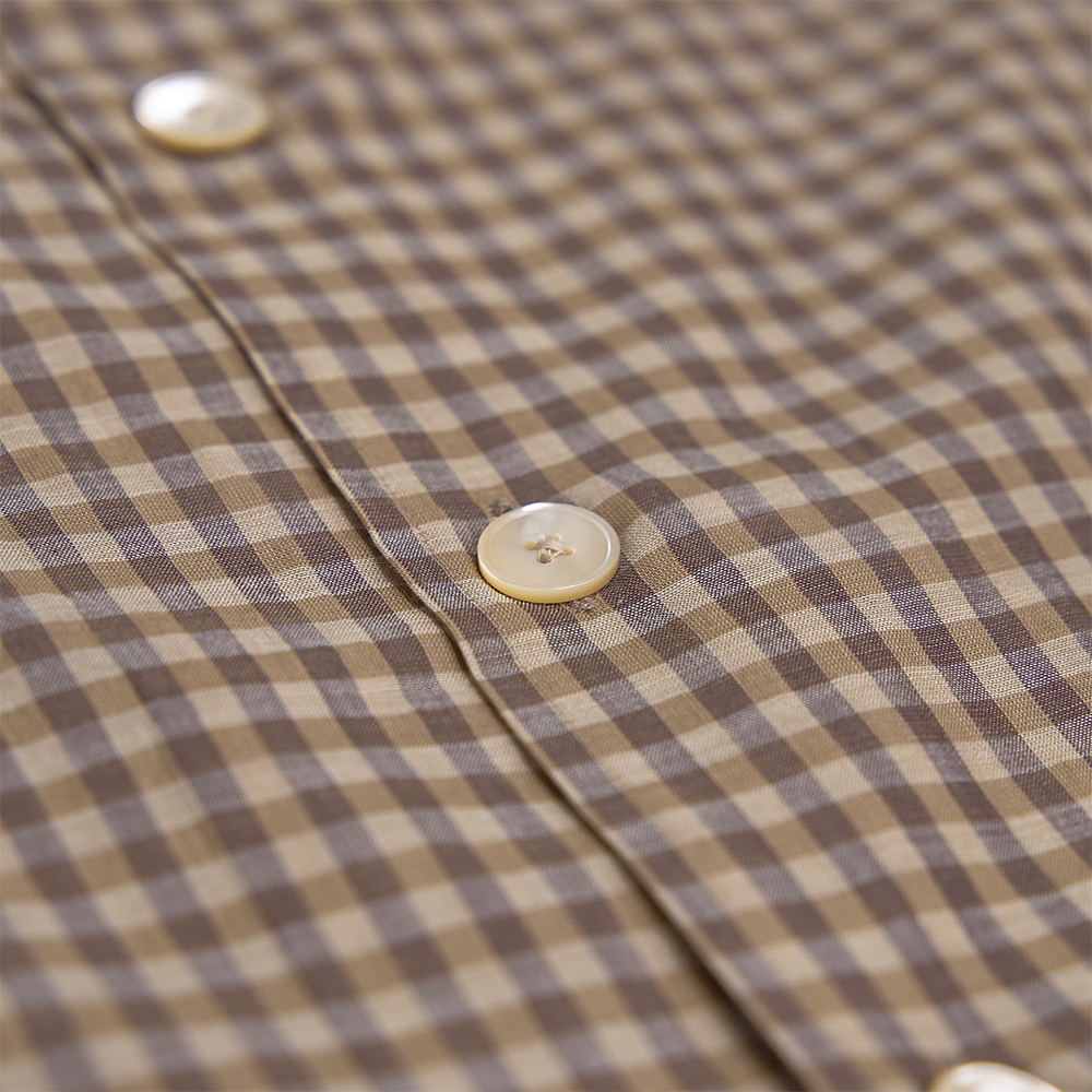 素材は、上質な細番手の超長線を使用した、コットンギンガムチェック素材を使用しています。極細番手の糸を丁寧に織り上げるため、1本1本に糊付けを施し、高密度に織り上げています。また、深みのある合いを表現するために、濃淡の異なる色に染め分けた糸を使用し、上品な透け感と軽やかな風合いを備えた、繊細で美しい素材です。