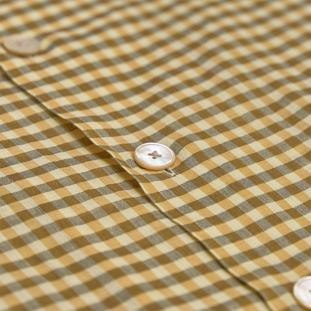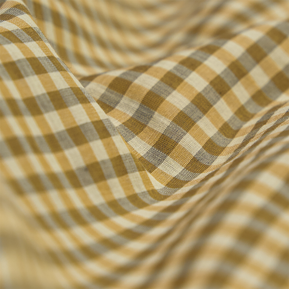 素材は、上質な細番手の超長線を使用した、コットンギンガムチェック素材を使用しています。極細番手の糸を丁寧に織り上げるため、1本1本に糊付けを施し、高密度に織り上げています。また、深みのある合いを表現するために、濃淡の異なる色に染め分けた糸を使用し、上品な透け感と軽やかな風合いを備えた、繊細で美しい素材です。