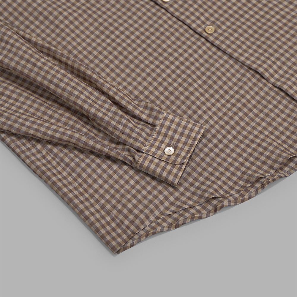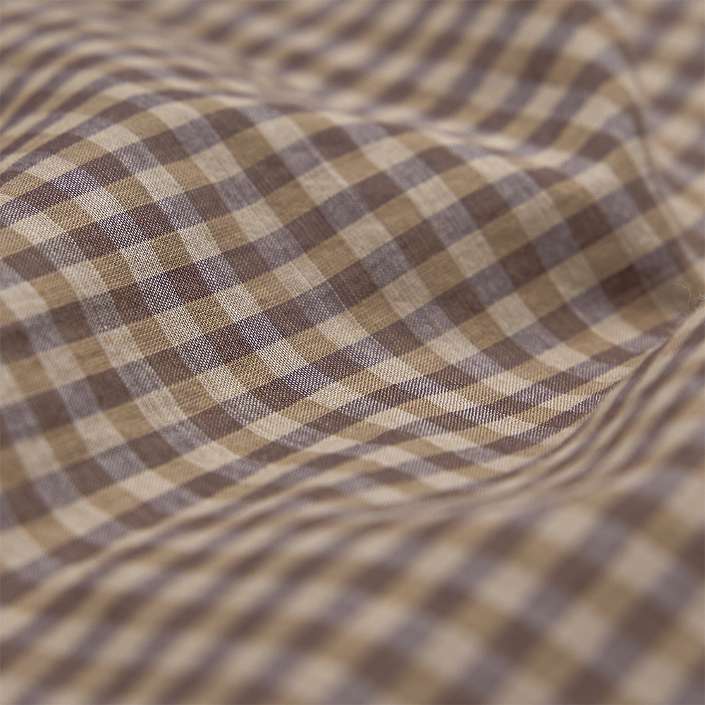 素材は、上質な細番手の超長線を使用した、コットンギンガムチェック素材を使用しています。極細番手の糸を丁寧に織り上げるため、1本1本に糊付けを施し、高密度に織り上げています。また、深みのある合いを表現するために、濃淡の異なる色に染め分けた糸を使用し、上品な透け感と軽やかな風合いを備えた、繊細で美しい素材です。