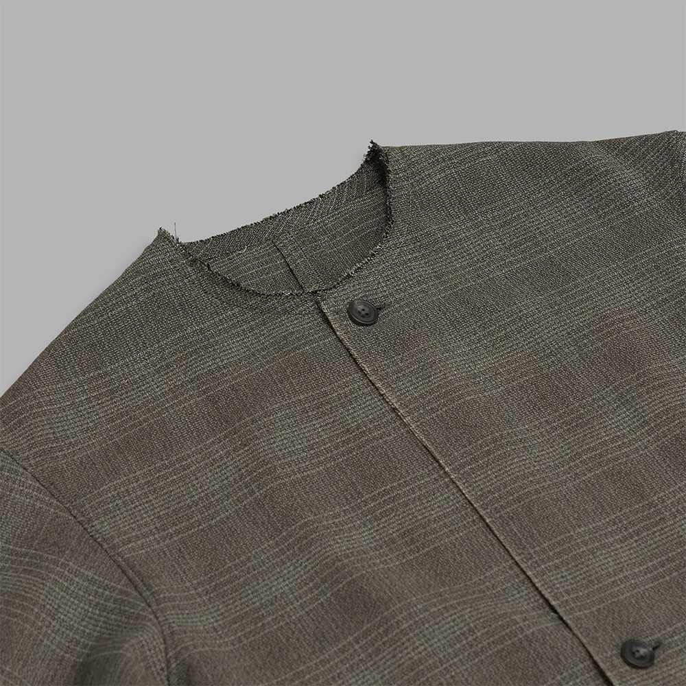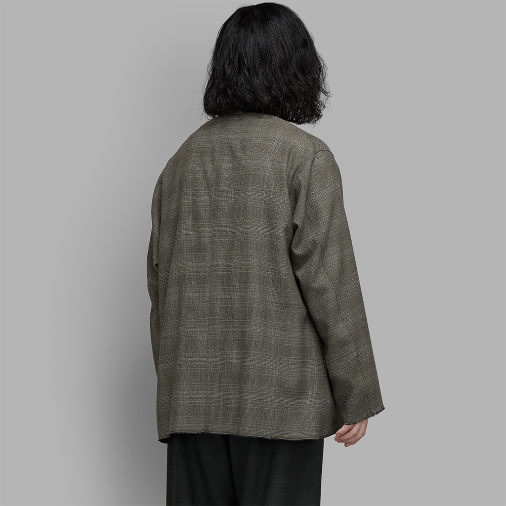 型は、全体的にゆったりとしたバランスにデザインされたノーカラージャケットです。前立ては襟元のトップボタンと中央の2ボタンで、内側は裏地のつかない一重のため、暖かい時期でも、シャツの感覚で、サッと羽織りやすいアイテムとしてデザインされています。