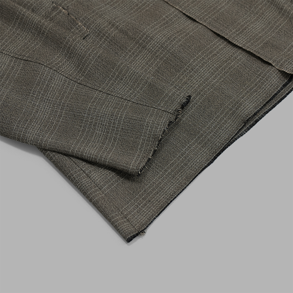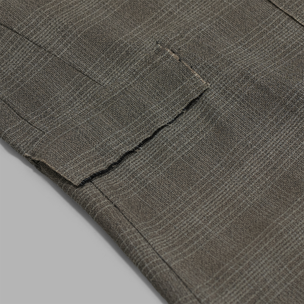 ウール,シルク,レーヨンを用いた、色や太さの異なる糸で織り上げたチェック素材を使用しています。厚みはシャツ生地程度の薄さですが、様々な糸が交わることで杢調の深みのあるチェック柄を表現しています。生地感はサラッとしたタッチと、ドレープが生まれるようなしなやかさが特徴的です。
