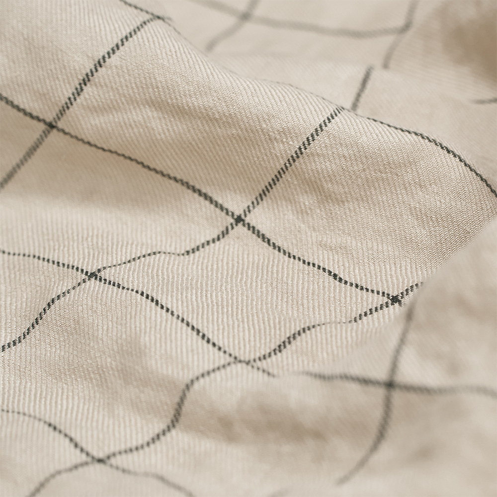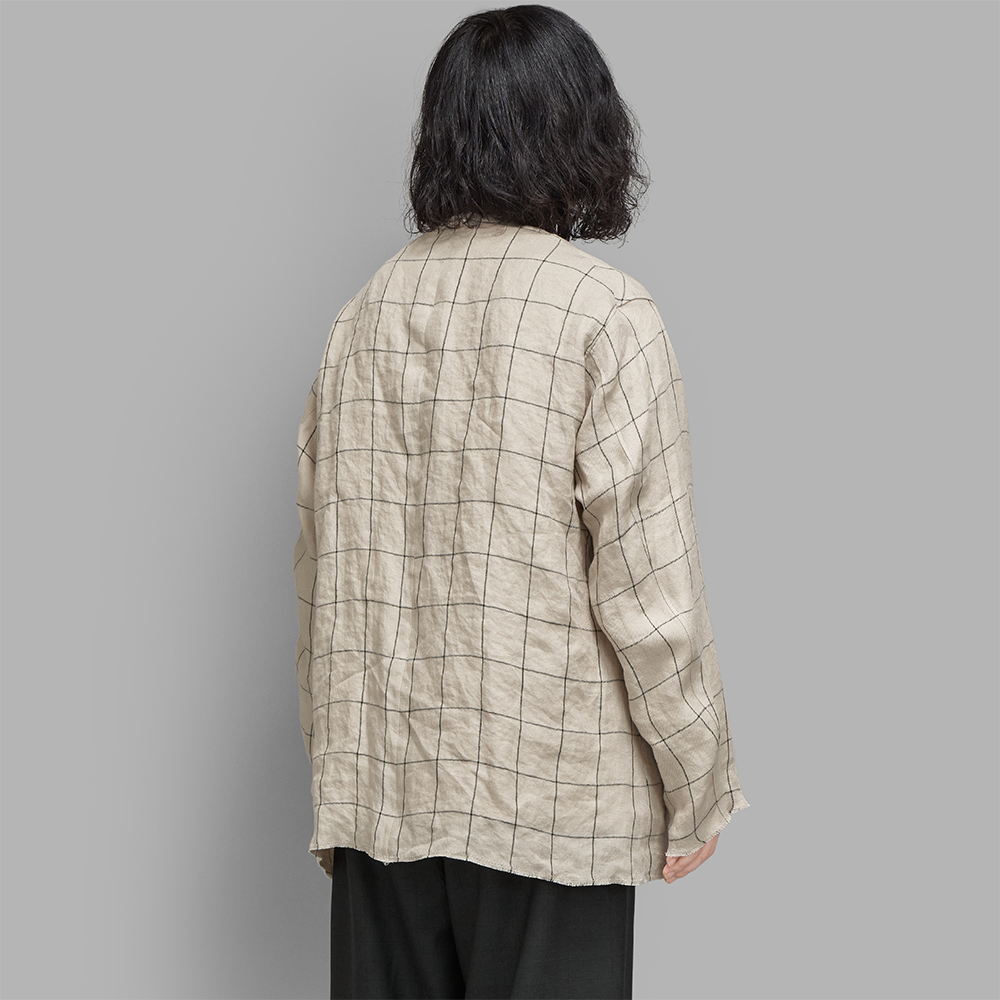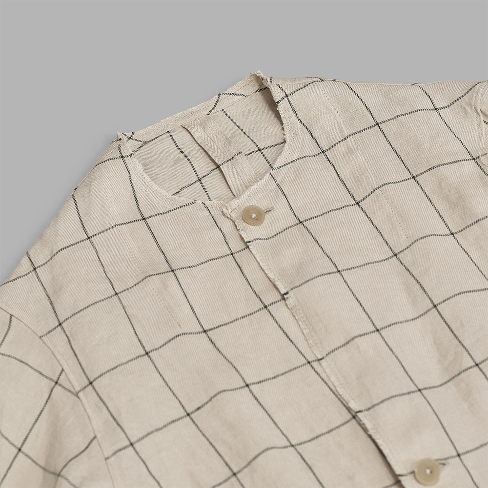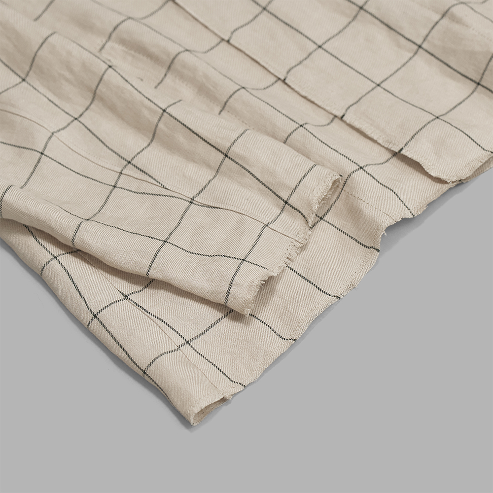 光沢を感じる上質なリネン原料を用いて、緩く織り上げたリネンチェック素材を使用しています。厚みはシャツ生地程度の薄さですが、リネン素材の膨らみとランダムに残るネップ、凹凸のあるシワ感によって、表情豊かな生地に仕上がっています。チェックのラインはグリーン系の色をあわせています。