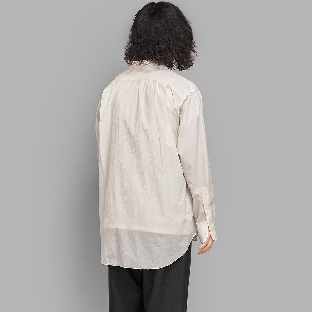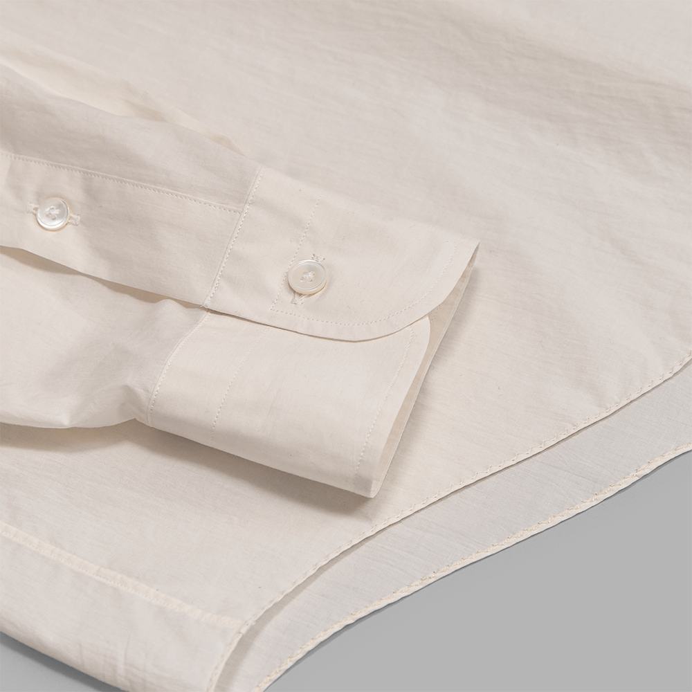 小ぶりの襟をはじめ、細かな運針やステッチを抑えたフレンチフロントにより繊細な印象を持たせつつ、柔らかなコットンの素材感と裾のハンカチ処理によって表情のある仕上がりとなっています。