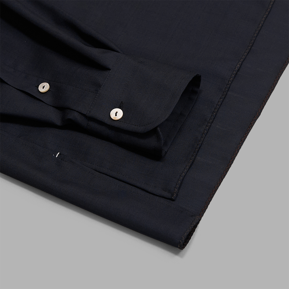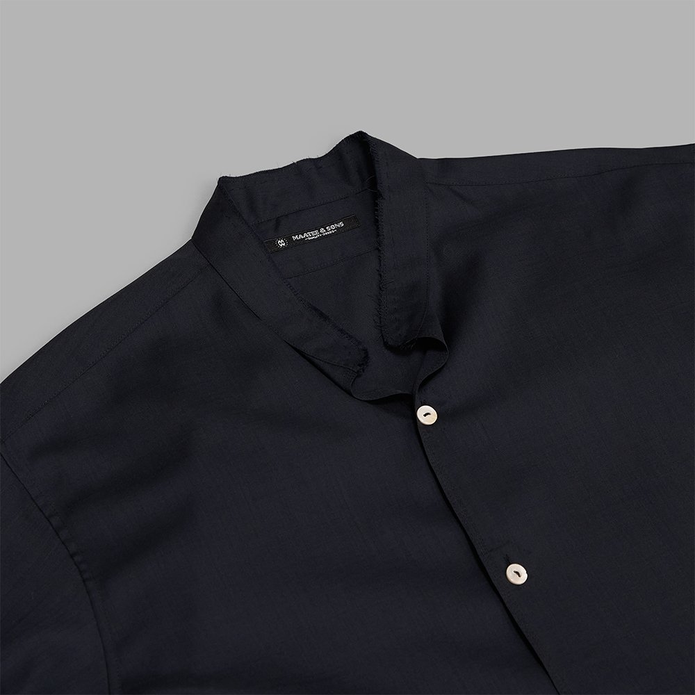 型は、程よくゆとりのあるサイズ感で作製されたスタンドカラーのシャツです。襟元は断ち切り仕様とし、補強が必要なボタンホール部分は表に干渉しないよう手まつりで仕上げています。剣ポロやスリットの閂、裾には配色の細かなステッチを施しています。