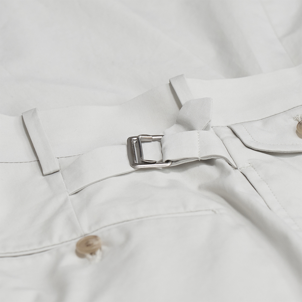 デザインは、アメリカ製の2プリーツトラウザーをベースにしています。サイドアジャスターやフラップ付きのコインポケットといったクラシカルなディテールを備えつつ、軽やかな生地を用いることで、野暮ったく見えない軽快な仕上がりです。腰裏はオリジナルのマーベルト仕様で、前立てはジップフライです。