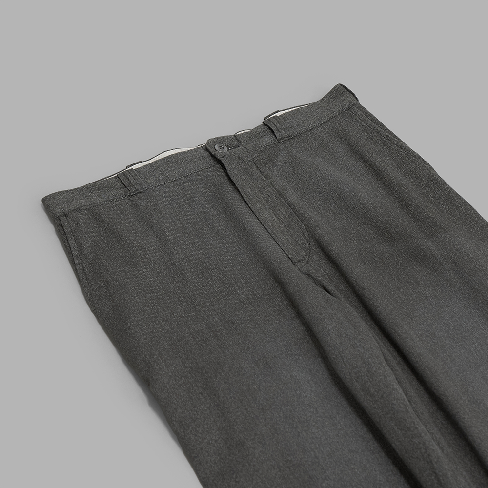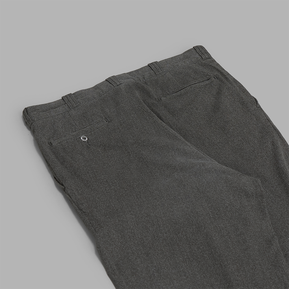 デザインは、50'sのUSワークパンツをベースにしています。やや太めのワイドテーパードシルエットで、縫製は、運針が細かく、丁寧な作りで、股には棒シックが付きます。ジップには、ヴィンテージを彷彿とさせる"WALDES"ジップが採用されており、フロントやヒップの鉄製のオリジナルタックボタンが、より一層の雰囲気を持たせています。