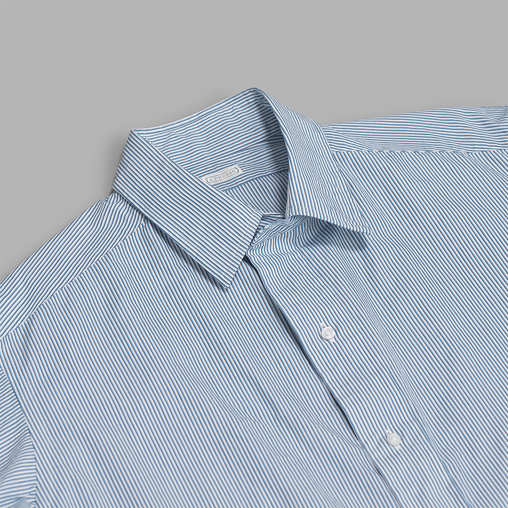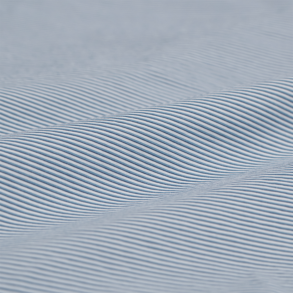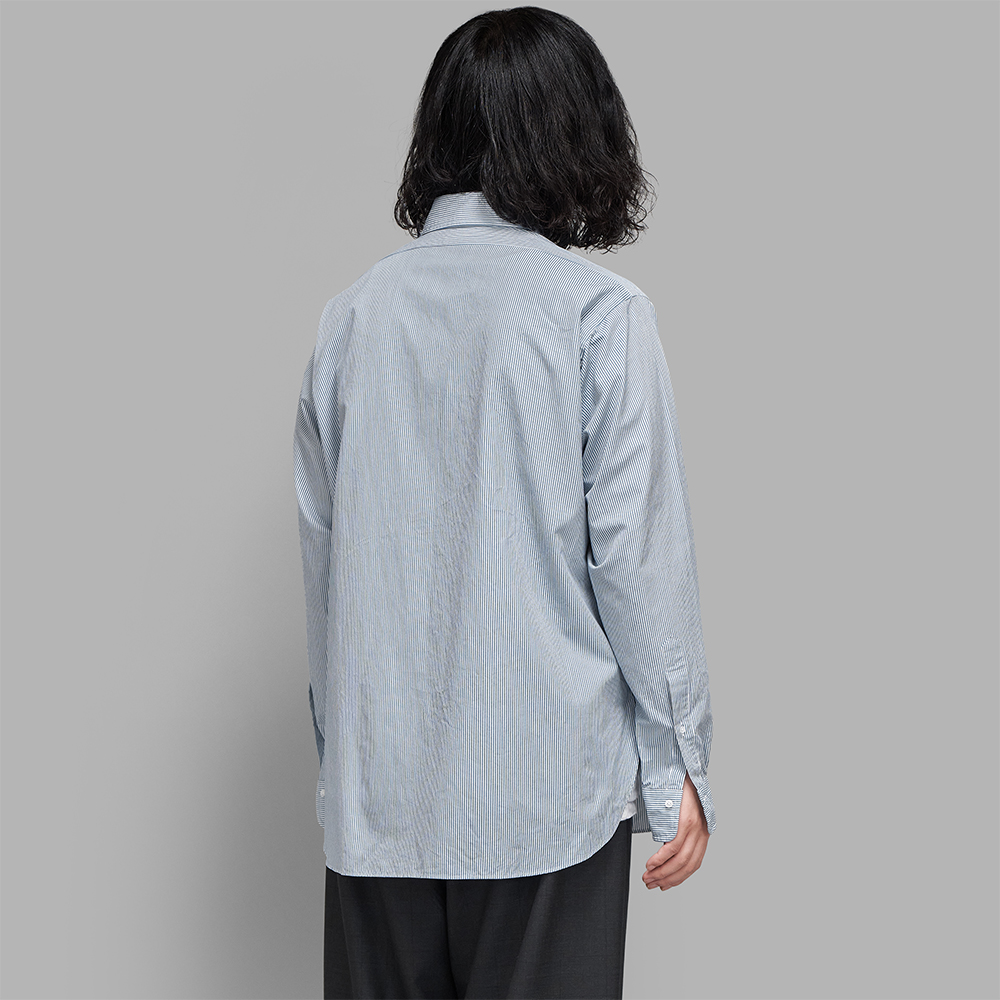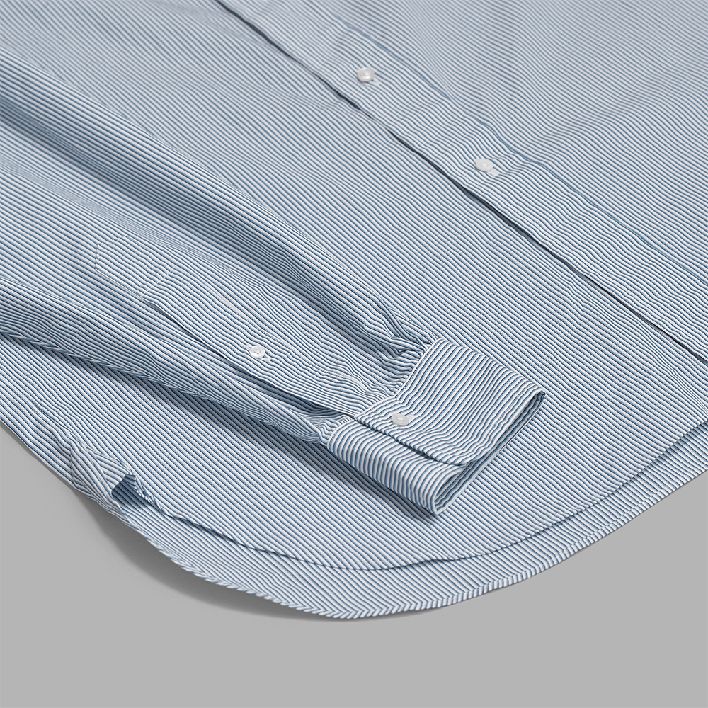 生地は、経糸に細番手のギザコットン、緯糸に細番手のスーピマコットンを使用し、高密度に織り上げたマイクロストライプです。ストライプ柄は、40’sのBritishオーダーシャツのヴィンテージから着想し、原料をアップデートする形で再現しています。