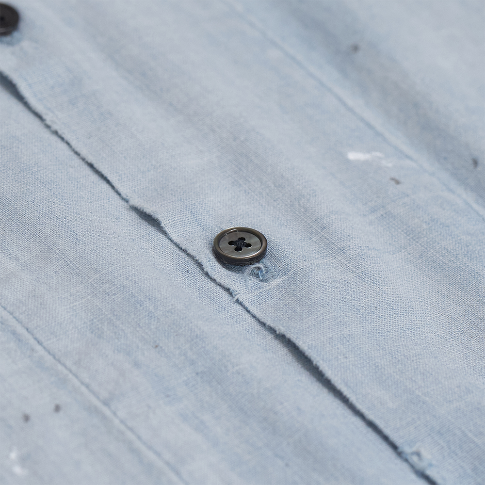 加工は、ヴィンテージのフェード感の強い経年変化を、職人による手作業で再現しています。リアルなワークウェアとして使われていたことがうかがえるペンキ跡も施し、雰囲気のある夏の着こなしをお楽しみいただけます。ゆとりのあるサイズ感で、長袖とのレイヤードや羽織としても取り入れていただけます。