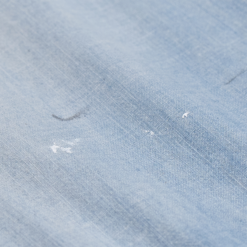 生地には、50’sの古着をベースに、約50年以上の経年変化によって糸がやせたような質感や風合いを再現したセルヴィッチシャンブレーを使用しています。タテ糸のインディゴは、60’sの少し薄く淡い色目に染色している点も特徴です。