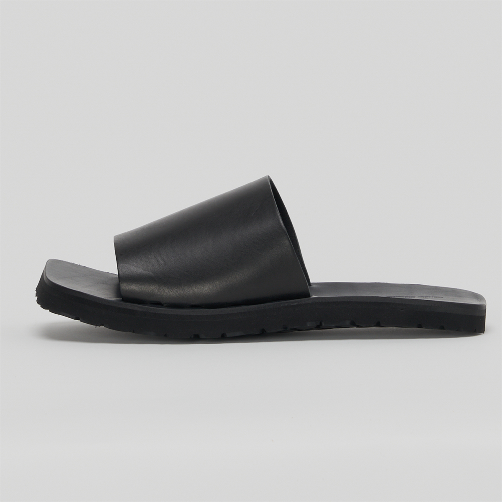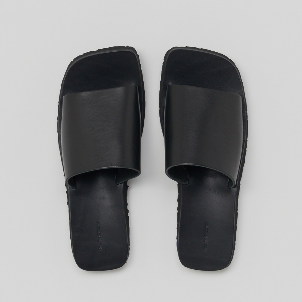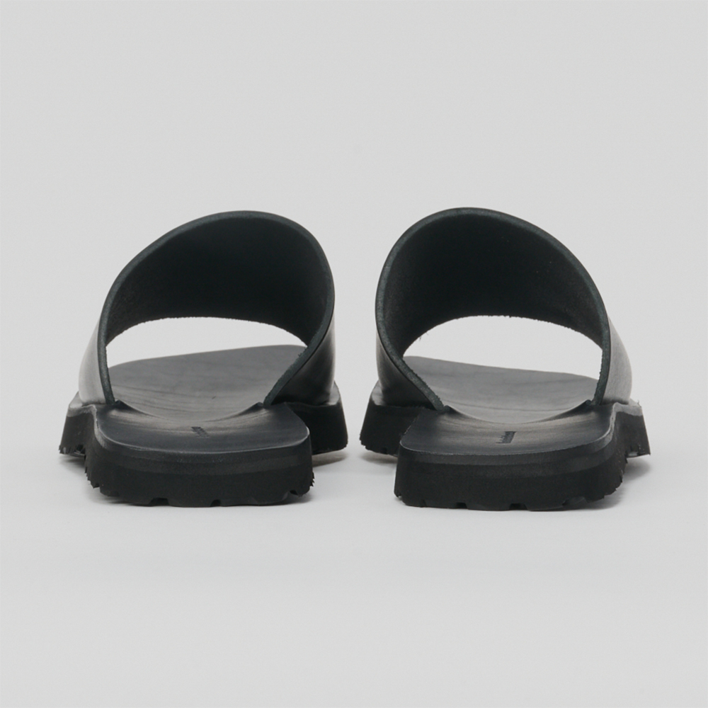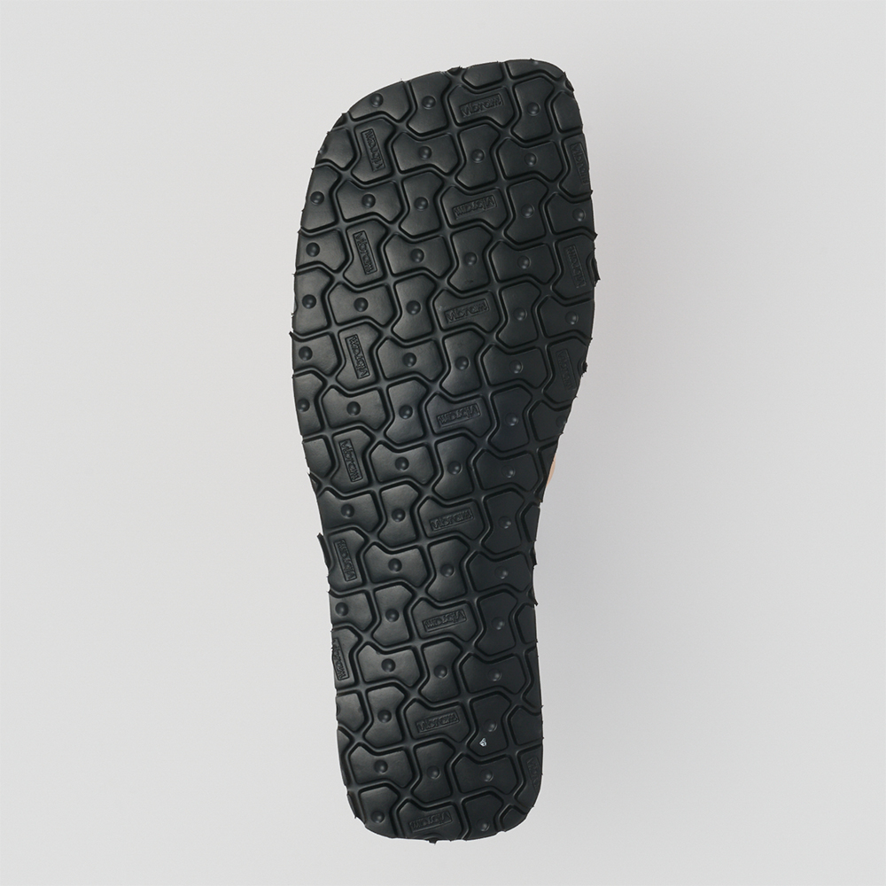 型はミニマルなオブリークトゥ形状のサンダルですが、ミッドソールとアウトソールは底面のゲージを数ミリ単位で内外差をつけて底貼りを行っているため、手間はかかりますが、立体的で丸みのあるフォルムで仕上げています。それにより、フィティングも包み込むような感覚を感じてもらうことができます。