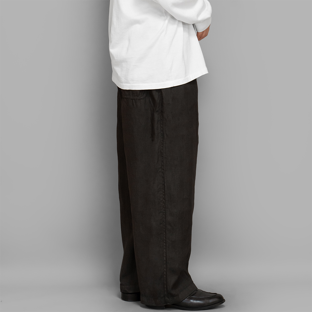 型は裾までストンと落ちるワイドストレートのシルエットです。ウエストはゴム仕様になっており、内側の紐でベルトなしでも快適に着用できますが、ベルトループも配しているため、ポケットをしっかり活用する際などにベルトを使用することも可能です。