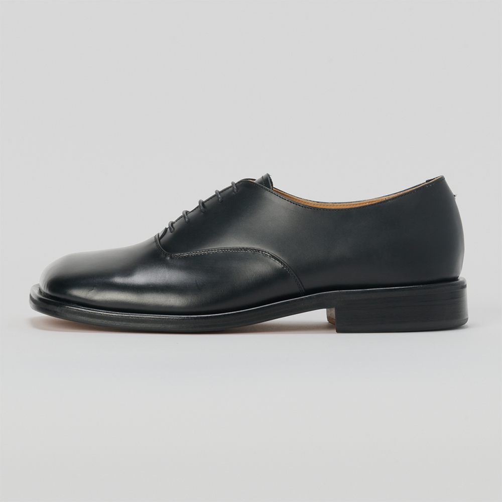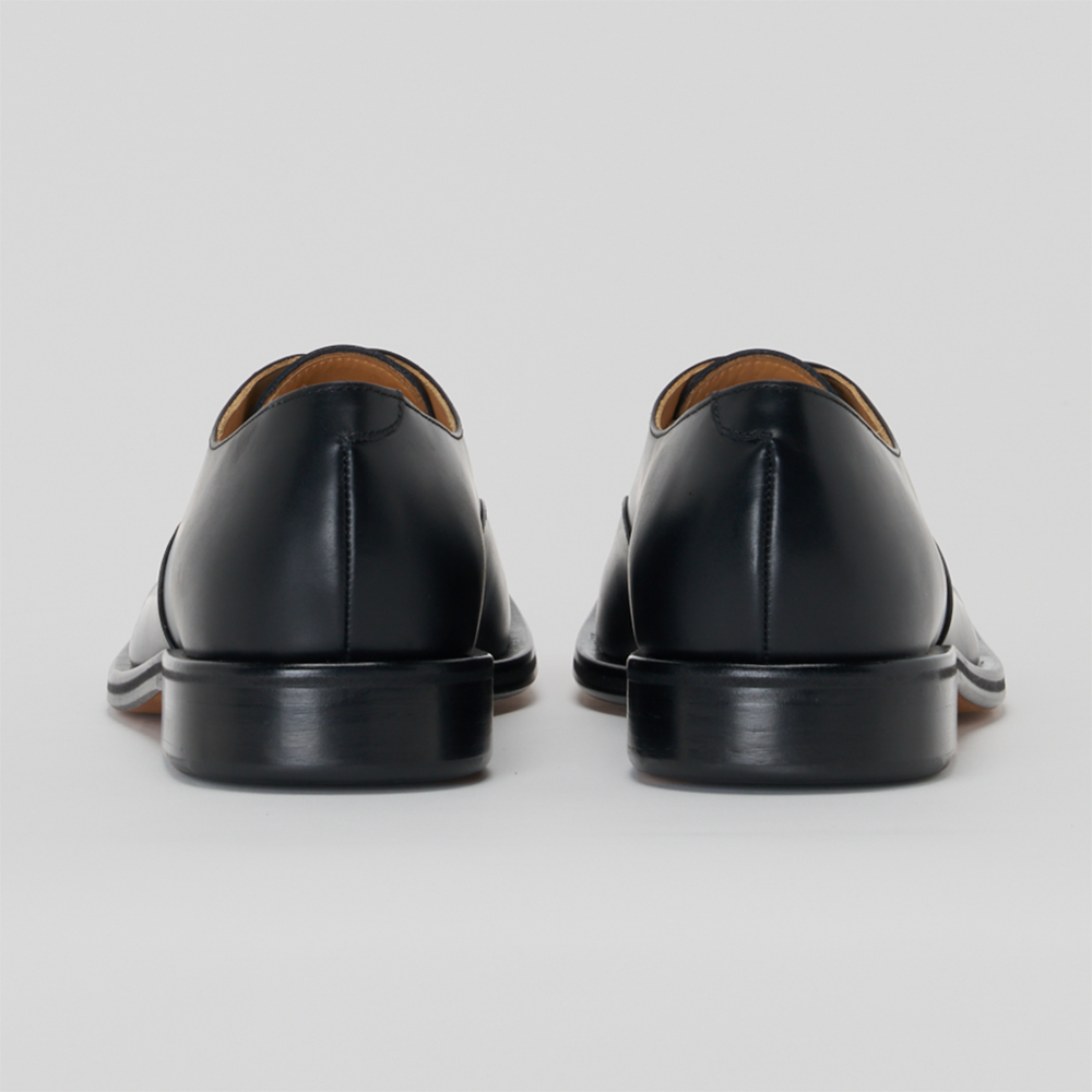 ウェルトのエッジもラストのフォルムに沿って、角を落とし、控えめな丸コバに仕上げています。実際に足を入れるとラストのインパクトを感じつつも、ワイドシルエットのボトムスなどに馴染みやすいシューズに仕上がっています。