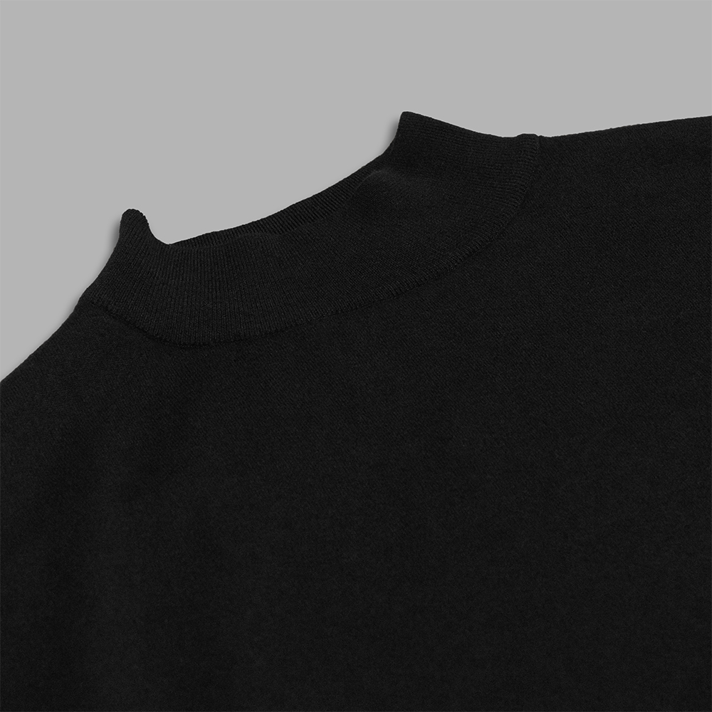 型は、高く詰まったネックに対して、ゆったりしたボディーバランスが特徴のモックネックニットです。身幅や袖幅をかなり広めにとっていますが、着ると落ち感が出て馴染みます。