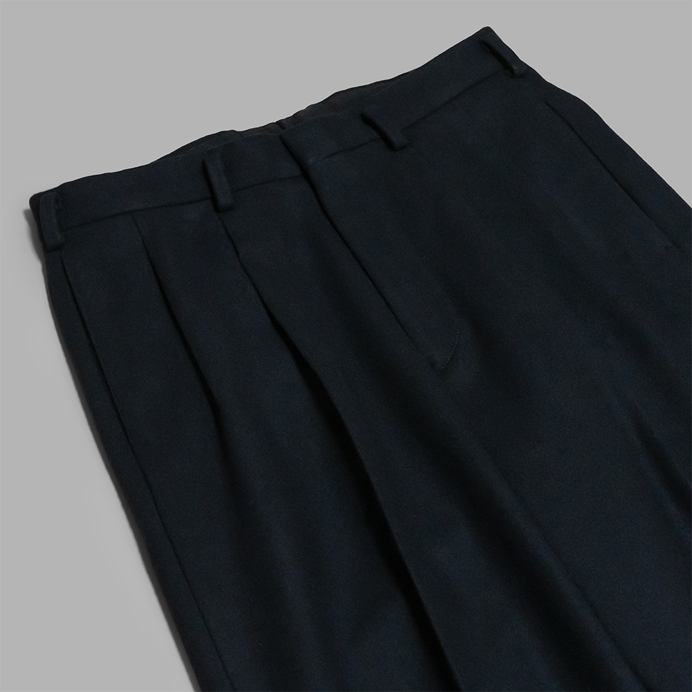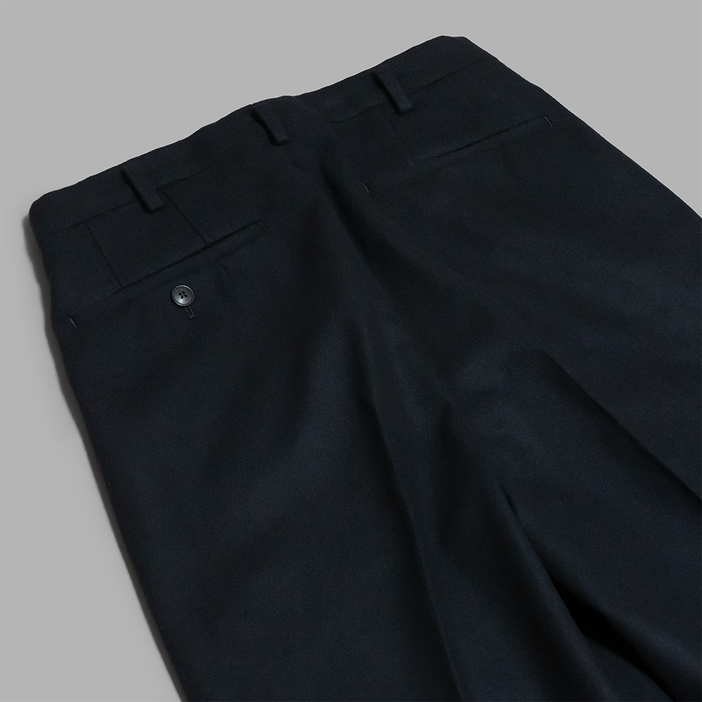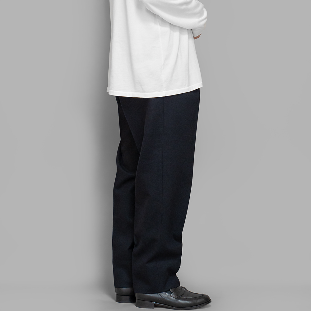 型はポストモダンを背景に生まれた1980年代のDCブランドのボトムスをベースに、当時のハイウエストで腰回りをフィットさせたクラシックなフォルムに仕上げています。前から見るとスッキリと、横から見るとたっぷりとしたワイドシルエットで、タイトすぎずルーズすぎない絶妙なバランスで作られています。前立てはジップフライで、中は前側のみ膝下まで裏地の付く仕様です。