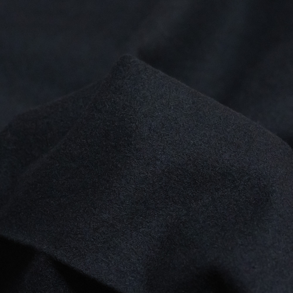 創業150年の尾州の機屋に作製を依頼した梳毛と紡毛をブレンドして作り込んだ、ウールフランネルの生地を使用しています。しっかりした厚みがありながらも、しなやかで柔らかな着心地を兼ね備えていることが特徴です。深みのある色合いが、より一層雰囲気を引き立ててくれます。