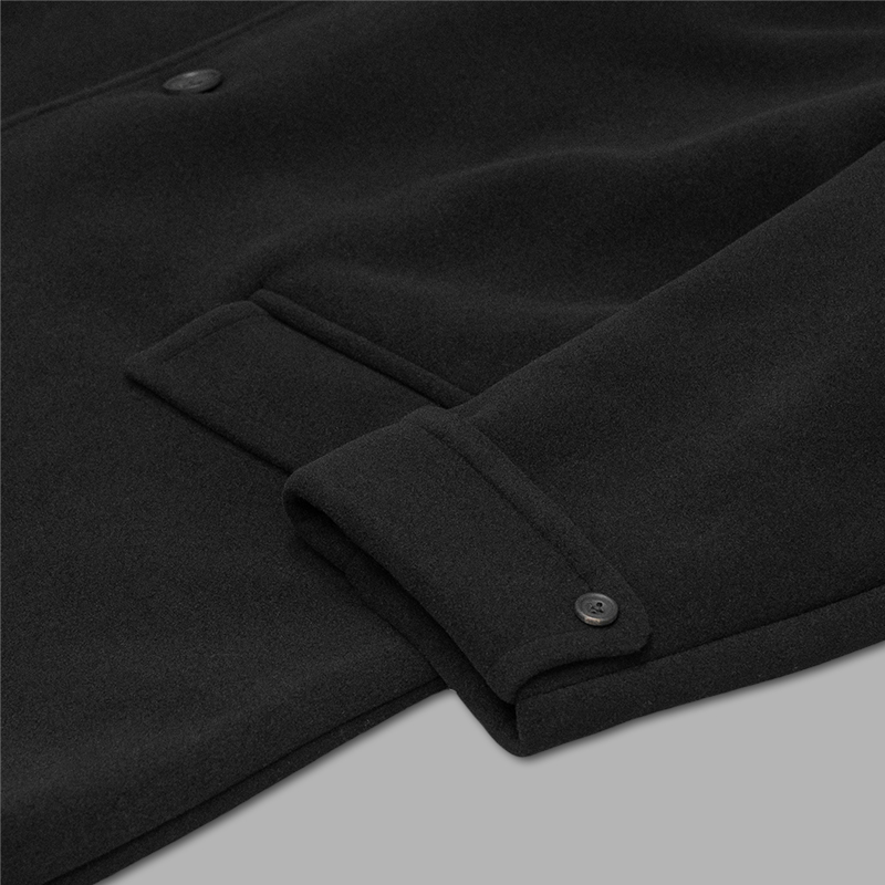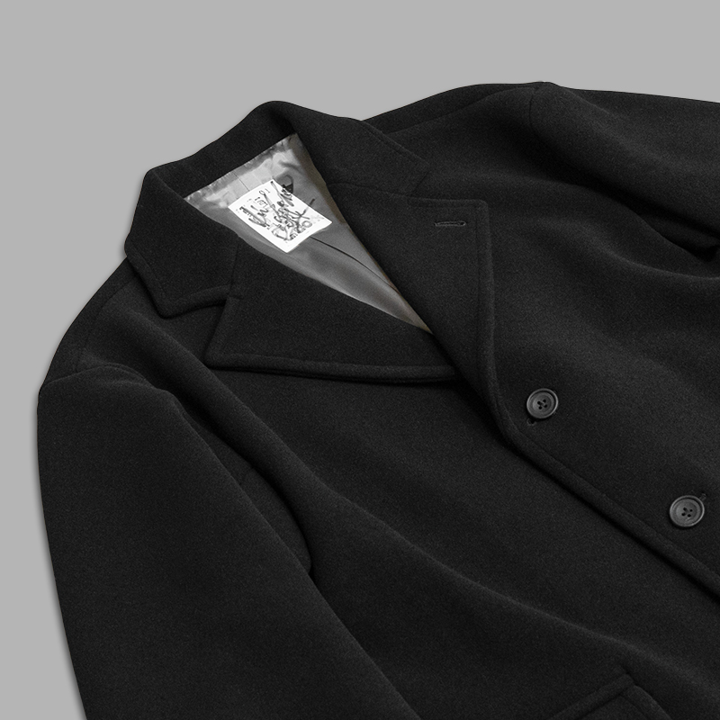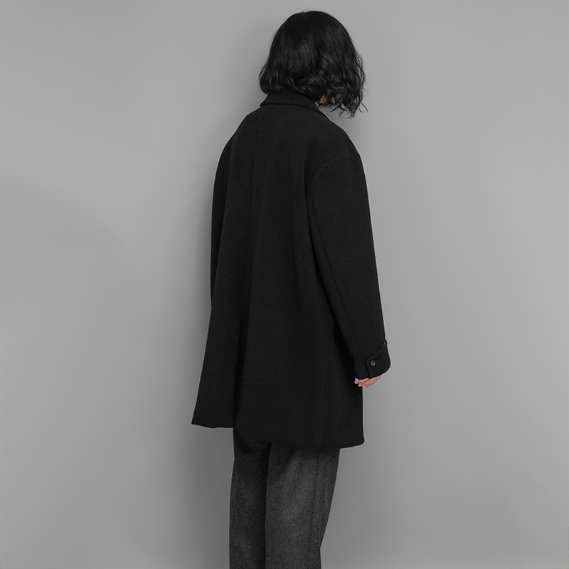 型は、ドロップショルダーのミドル丈のコートです。襟元にはボタンが付けられているため、襟を立てて、上まで留めて着ることもできます。袖口は片側のみ、折り返してボタンで縫い留めています。中はキュプラの総裏で内ポケットが2つ付きます。