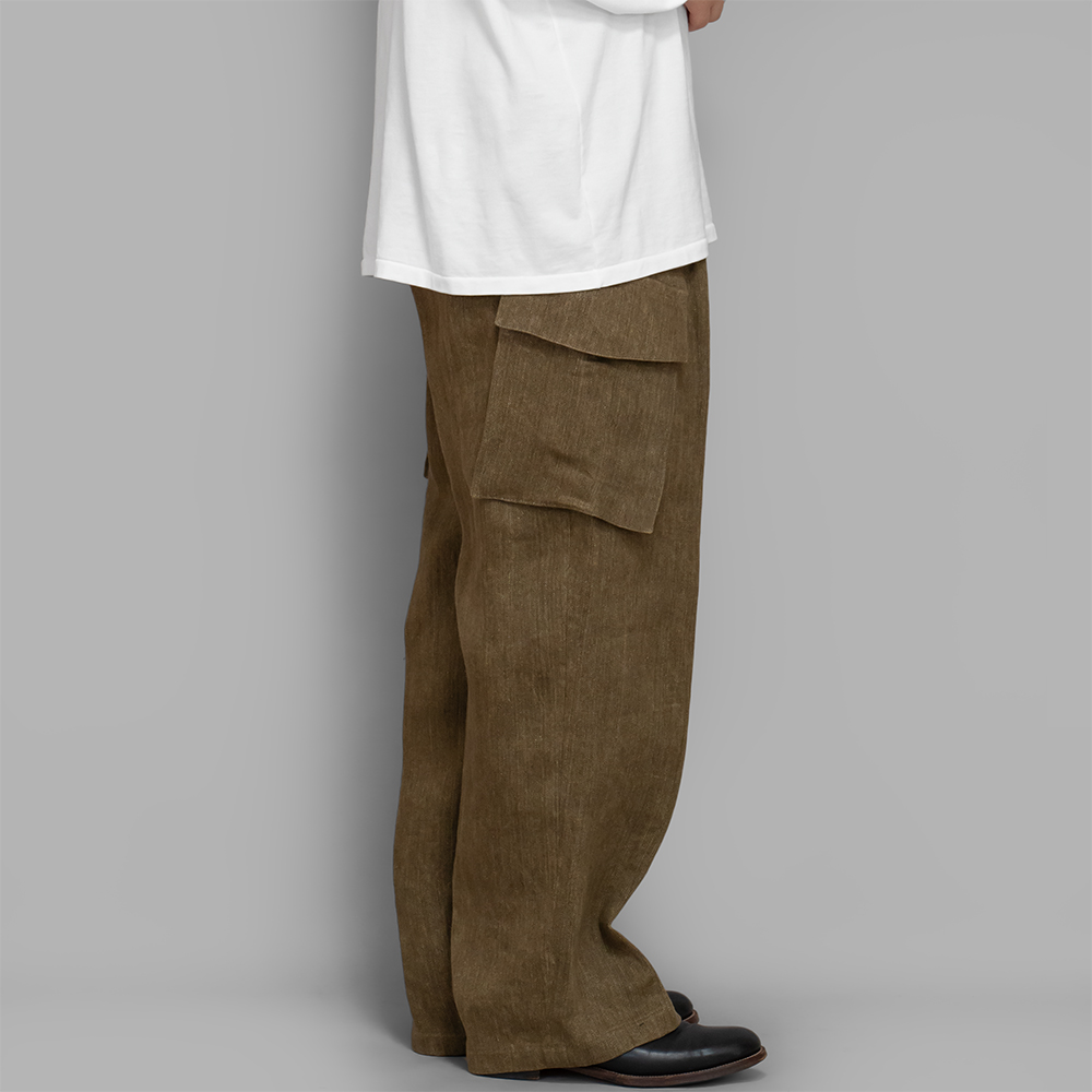 こうしたヴィンテージさながらの生地を使用しながらも、パタンナーTS氏による計算されたサイズバランスや、ディティールのデザインが加わることで、どこか上品な印象も受けるカーゴパンツに仕上げられています。そのため、スウェットやニットであわせるラフなスタイルだけではなく、上質な生地を使用したシャツやジャケットとの着こなしも楽しむことができます。