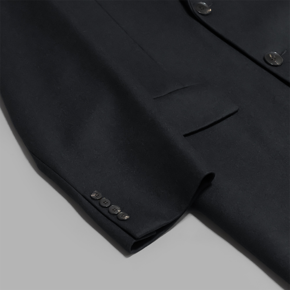 Super130'sの上質な原料を使用した梳毛糸を贅沢に使い、二重織組織でしっかりと織り上げたメルトン素材を使用しています。繊細で丁寧な縮絨工程を施すことで、きめ細やかな毛羽が凝縮されたメルトンに仕上げています。二重織のメルトン素材ですが、繊細な光沢と滑らかで柔らかい風合いの極上の素材です。
