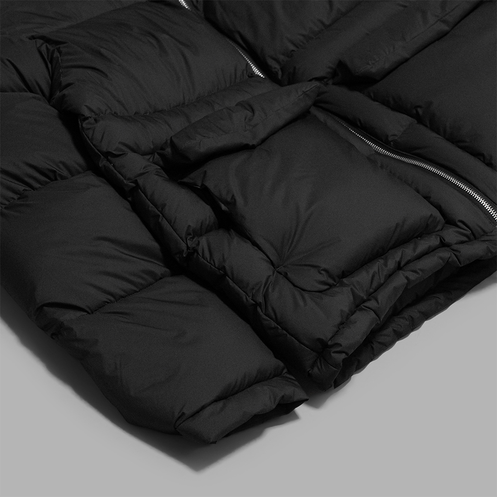 型はボックスシルエットで、身幅を広めにとっています。ポケットは二重構造で、フラップ部分とサイドで2種類のポケットが付きます。フロントのパーツには艶消しシルバーのririジップを採用。裾にはドローコードが通ります。