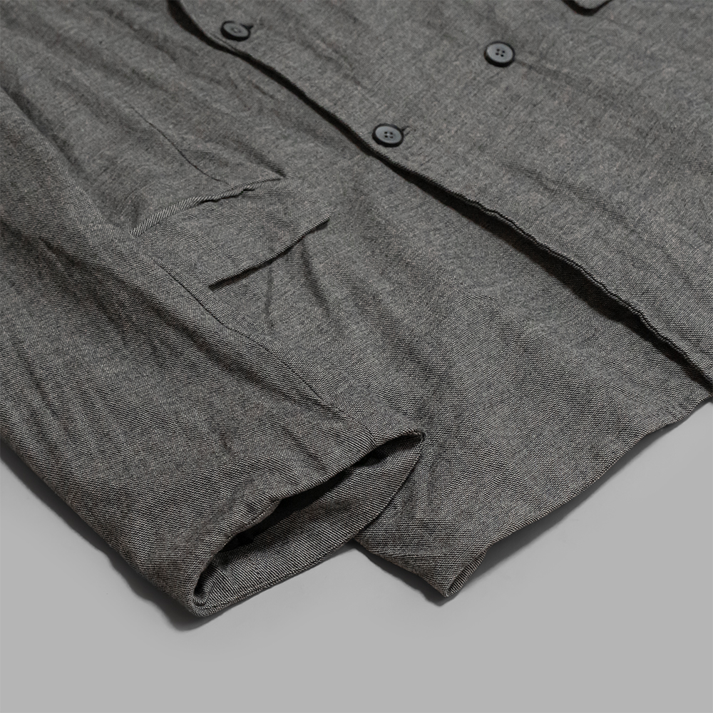 スーパー200原料のウールとカシミヤを用いて織り上げたシャークスキン素材を使用しています。ブラック/グレー/ブラウンの糸を組み合わせた色味は、複雑で深みのある独特なグレーを表現しています。とても滑らかなタッチと柔らかい質感が特徴的な生地です。