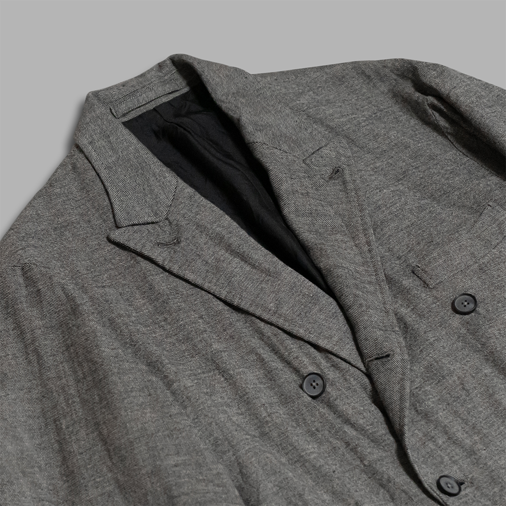 型はダブルのジャケットを、シャツの様に軽くリラックスして着用できるように、芯地をほぼ使わずにデザインされたジャケットです。ラペルはAMFステッチの入る、ややすっきりとしたピークドラペルです。また、襟を立てて着用できる様に襟裏にボタンが付きます。中は贅沢にシルクツイル素材の総裏仕立てで、内ポケットが2つ付きます。