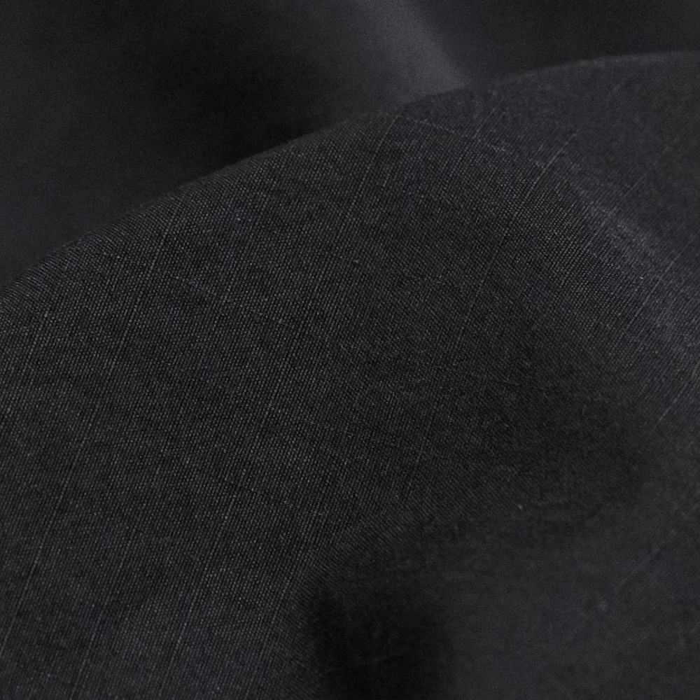 表地は、経糸にギザコットン、緯糸にシルクスパン糸を使用した生地を使用しています。経緯で僅かに濃度差をつけ、チーズ硫化で糸染めしヴィンテージ加工を施すことで、色合いを保ちつつコシが抜けた上品かつソフトな生地の風合いと軽さが特徴の生地に仕上げています。